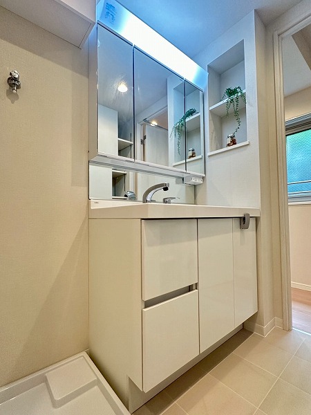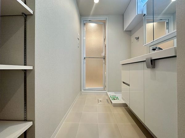 洗面室・洗濯機置き場・浴室がひとまとめになった機能的なサニタリースペース。動線もスムーズで、家事効率もアップ!浴室には追焚き・乾燥機能を搭載し、毎日のバスタイムを快適にサポートします♪