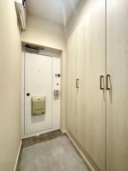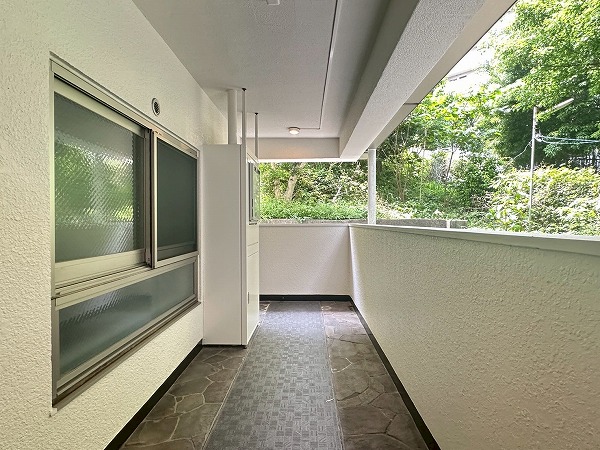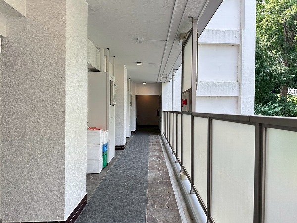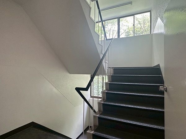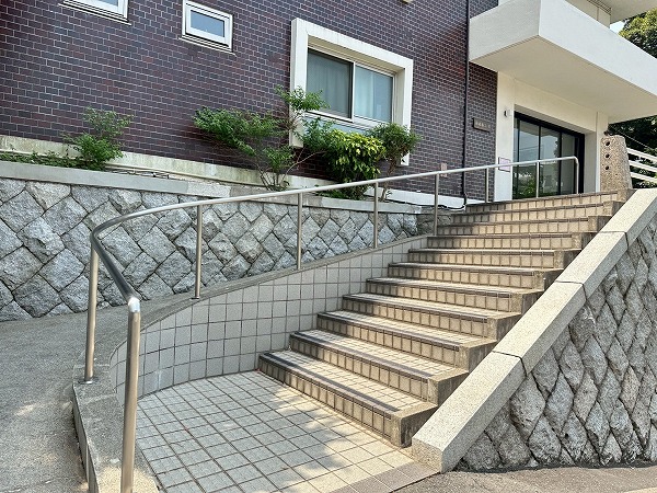 階段造りのアプローチを進むと、大きなエントランス入口がありました。通路は広々としており、スムーズな出入りが可能です。