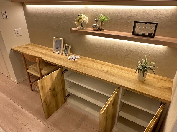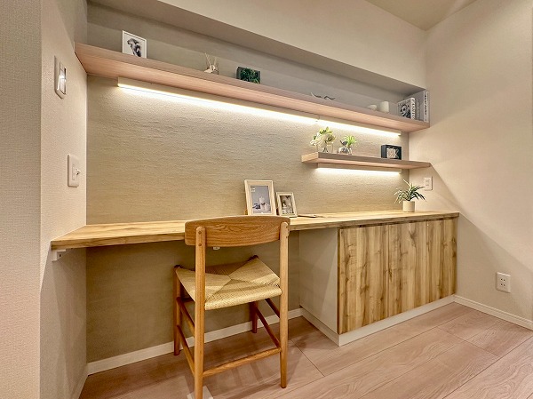 メインルームにはリモートワークや趣味の時間にぴったりなDENコーナーを完備。デスクカウンターを活用して、仕事も勉強も快適に。お気に入りの小物で飾れば、自分らしい空間が完成しますよ◎