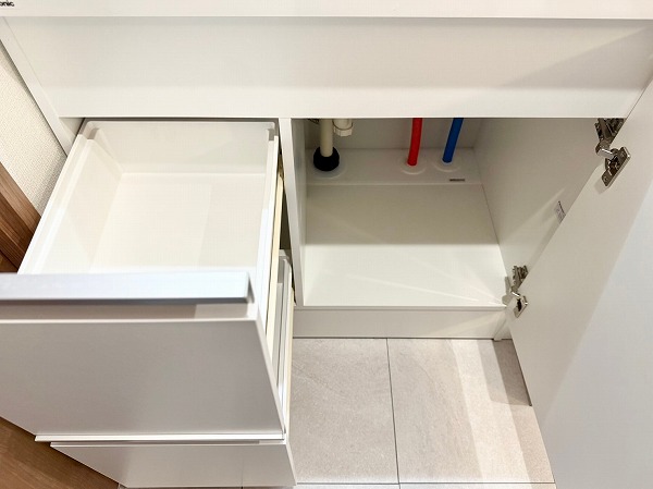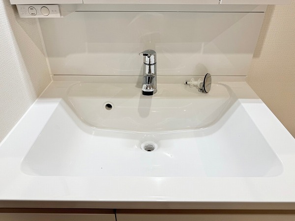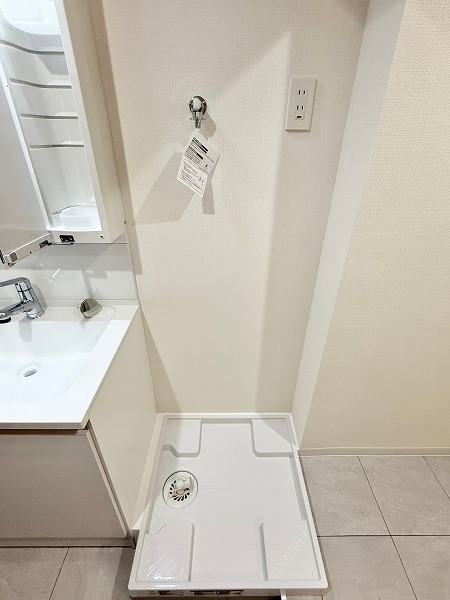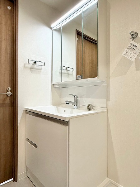 洗面台・洗濯機置き場・バスルーム・トイレがひとまとめになったサニタリースペース。コンパクトながら動きやすく、毎日の支度がスムーズです。白い洗面化粧台は3面鏡タイプで、細かいアイテムもキャビネットにすっきりしまえます◎
