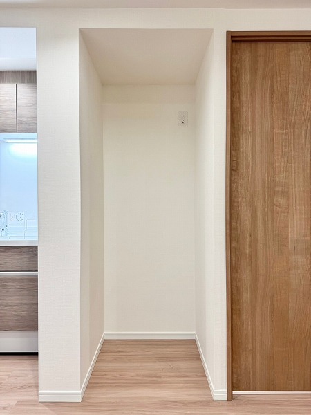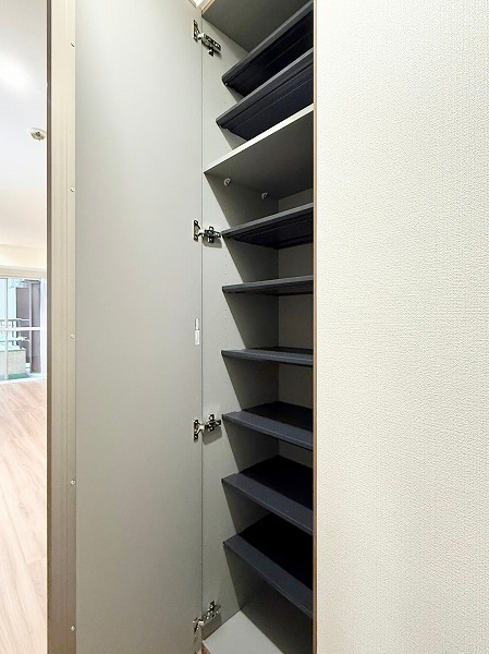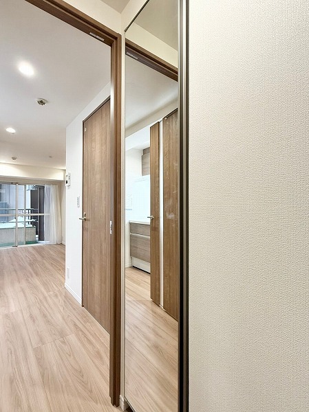 ホワイトクロスと木目の床が印象的な、洗練された玄関空間。扉の裏には全身鏡が備わり、開けば収納力の高いトールシューズボックスが。出発前の身だしなみ確認も手間なく行えます。