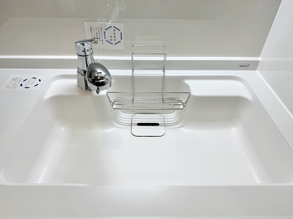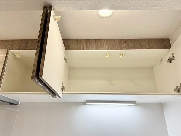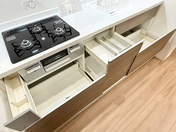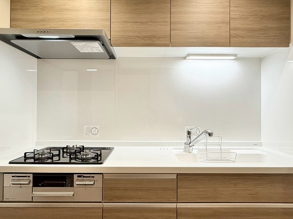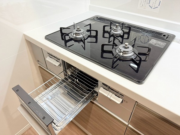 キッチンは料理に集中しやすい壁付タイプ。グリル付き3口コンロを備えており、同時調理もスムーズに行えます。上下に収納があるため、お皿や調理器具などの細かいアイテムもきれいに整理できるのが嬉しいですね。