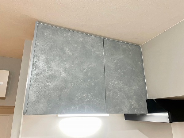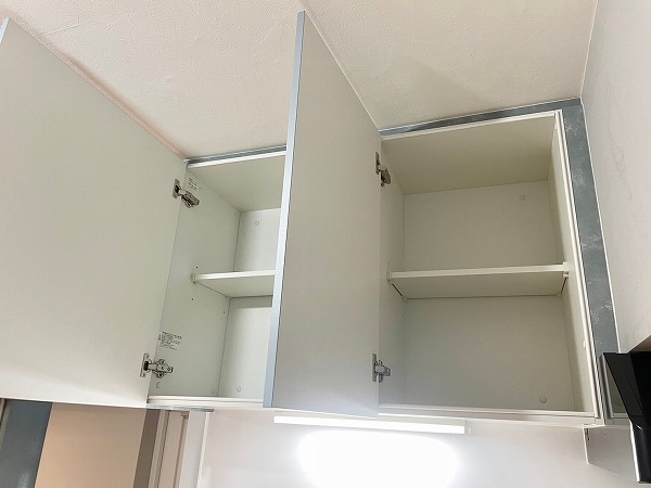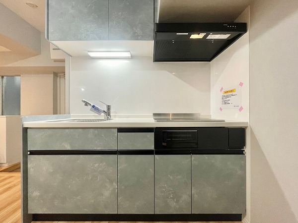 上品なグレーデザインの壁付けキッチンは、効率よく調理ができるシンプルな形が魅力。コンロとシンクの間に余裕のある作業スペースが確保されているため、下ごしらえや盛り付けもスムーズです。上下に収納が備わっており、調理器具や食器もすっきり片付けられます◎