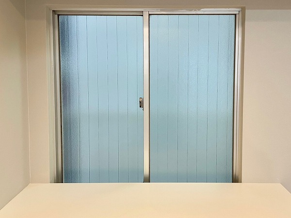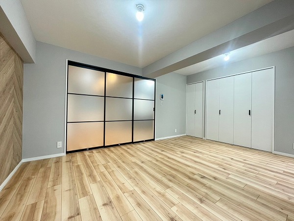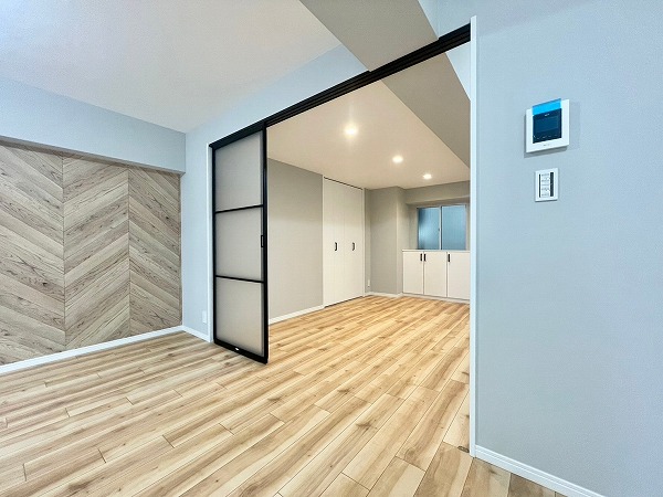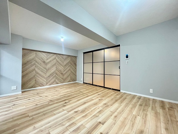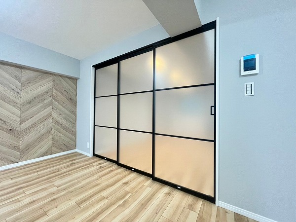 ヘリンボーン柄のアクセントクロスに加えて、ライトグレーの壁紙とホワイトサッシの組み合わせが優しい空気感を生む可愛らしい洋室。リビングとはスライドドアで区切ることができ、曇りガラスのおかげで視線はさえぎりつつも閉塞感はありません。柔らかなデザインが心をくすぐります♪