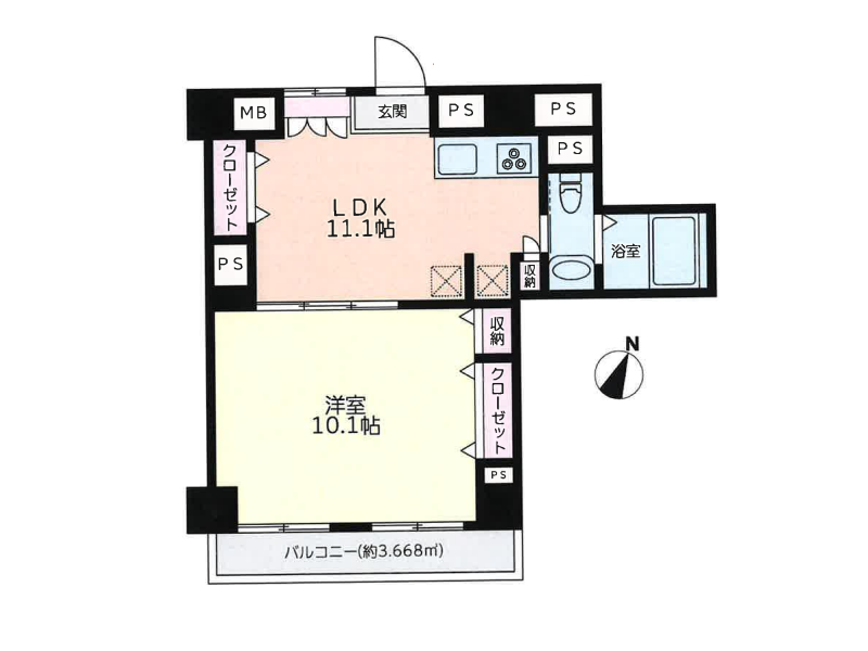 約11.1帖のメインルームは玄関から直結するレイアウトでスペースを最大限活用できるのが魅力。部屋全体を広く見せたい方には嬉しいポイントですね。来客時には観葉植物やパーテンションを使って生活空間をさりげなく隠すなど、工夫のしがいがあります✧