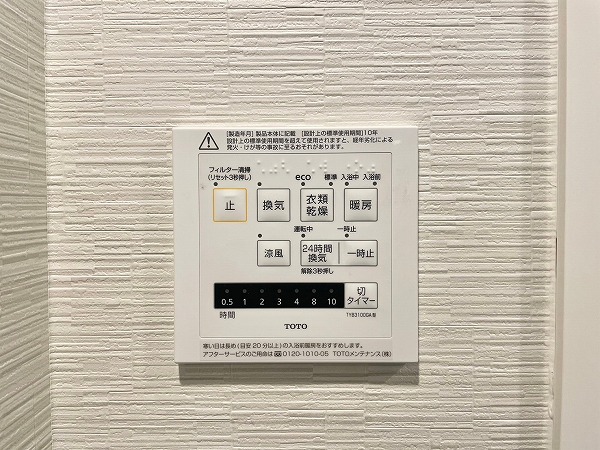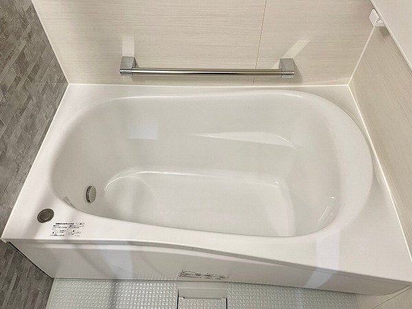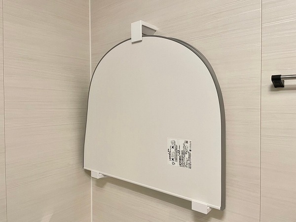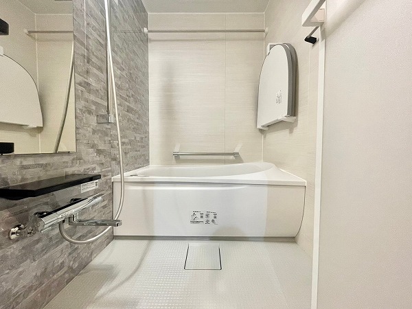 淡いグレーのパネルが上品なバスルームは、リラックス感のある優しい空間に♡バスタブの近くには手すりが付いており、立ち上がる際も安心です。縦長のミラーは全身のチェックに便利で、使い勝手はもちろんデザイン性もしっかり考えられていますね。