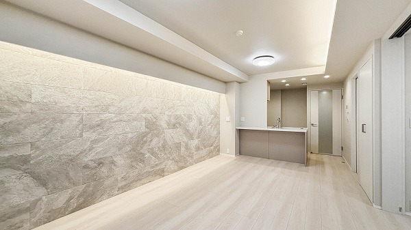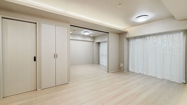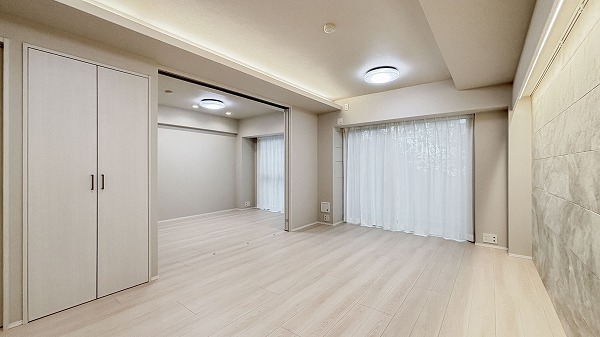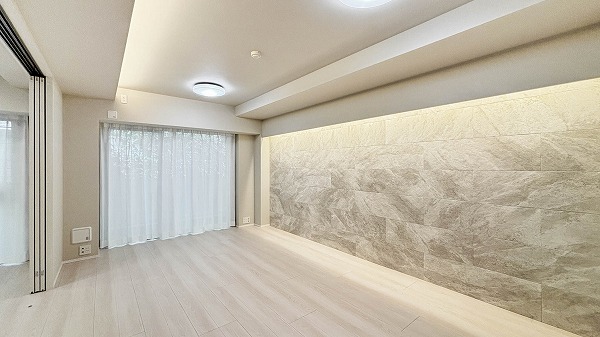 奥行きのあるリビングには一部アクセントクロスが採用されていて、立体感を感じられました。明るく穏やかな光に満ちたリビングで、季節の移ろいを感じながらゆったりと過ごせます。