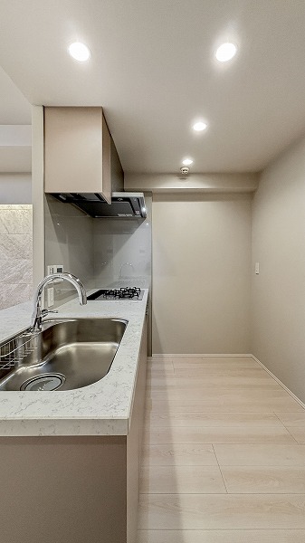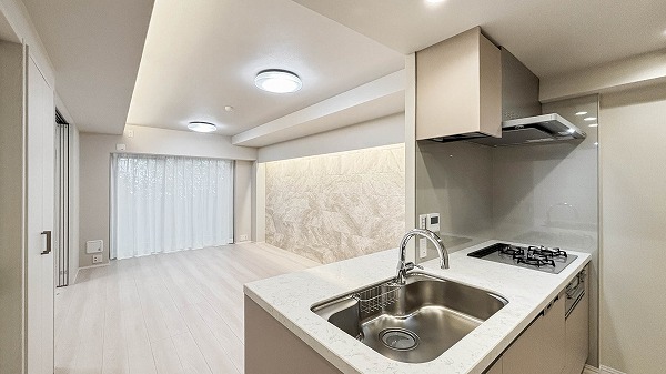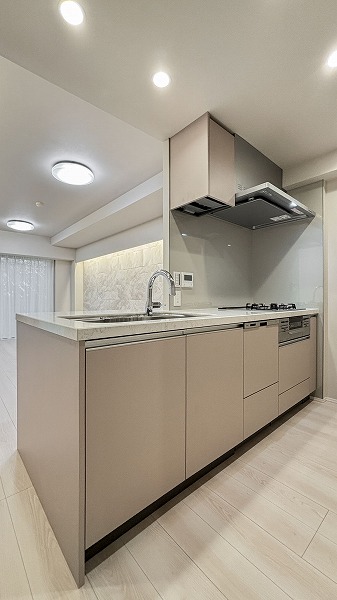 リビングと緩やかにつながりながらも、独立したスペースとして確保されたキッチンは、生活感を見せたくない方に嬉しいレイアウト。グリル付き3口コンロ、食洗機、浄水器など便利機能満載で、日々の家事の効率を高めてくれます。