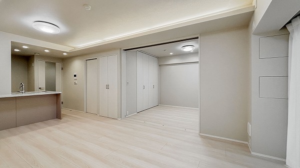 南向きのバルコニーに面したリビングダイニングは、窓いっぱいに広がる光が心地よく差し込み、自然と深呼吸したくなる開放感に満ちています。約11.6帖の広さがあり、ダイニングセットとソファをゆったり配置できる余裕のある空間。