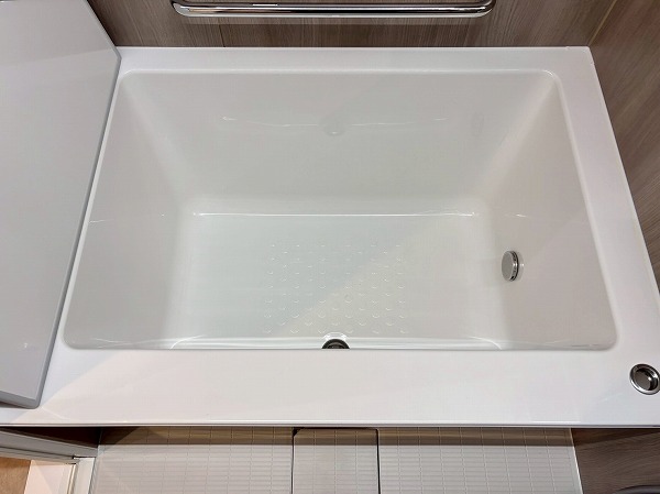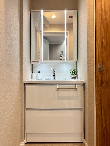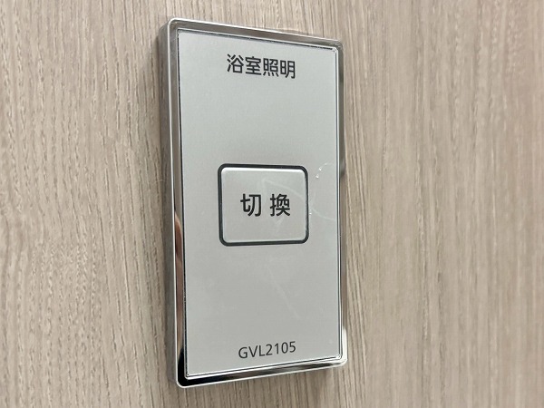 落ち着いたブラウンのパネルが使用されたバスルーム。ワイドなミラーが開放感をもたらしていますね。バスタブの傍には照明の操作パネルが。お好みの明るさでご入浴いただけます。バスルーム内を暗くして、キャンドルを灯してリラックス、なんて素敵なひと時を楽しんでみては。