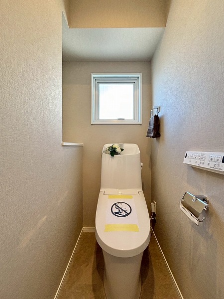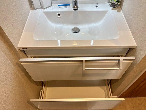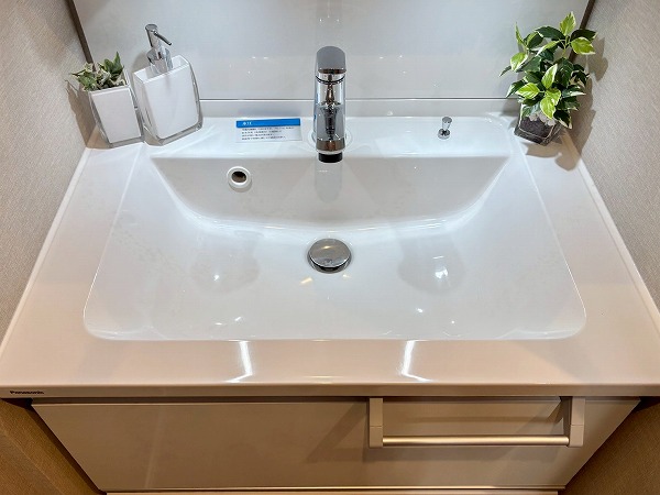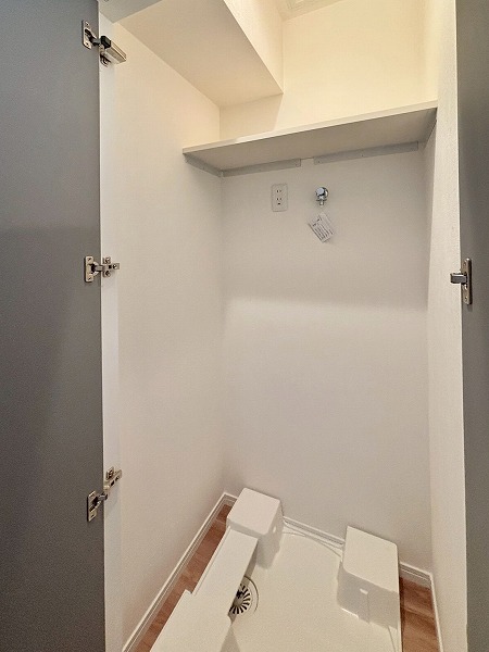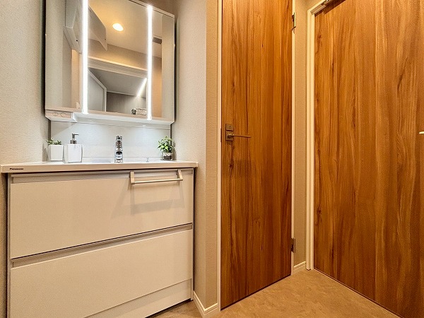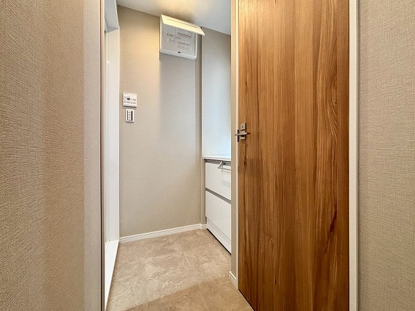 サニタリールームは玄関右手に。洗面化粧台とトイレ、バスルームがまとまっています。洗濯機置き場はキッチンの奥に設けられていました。洗濯の際に洗濯物をキッチン側に運ぶ手間はありますが、その分バルコニーに近いので干す際にスムーズに移動できます。