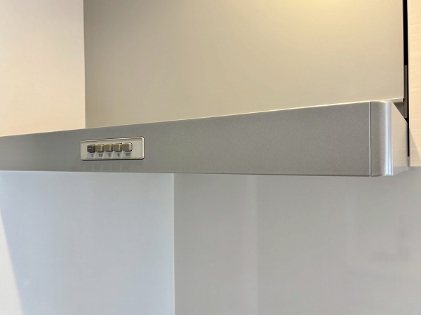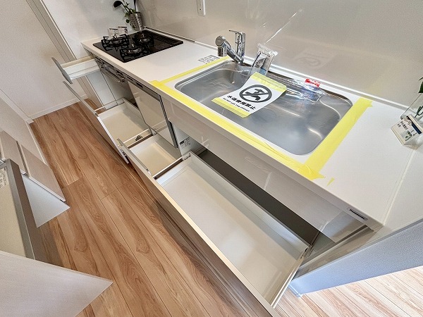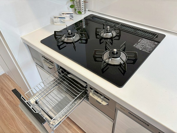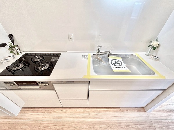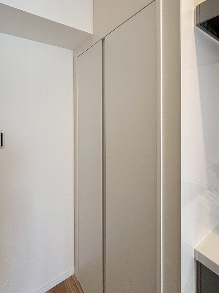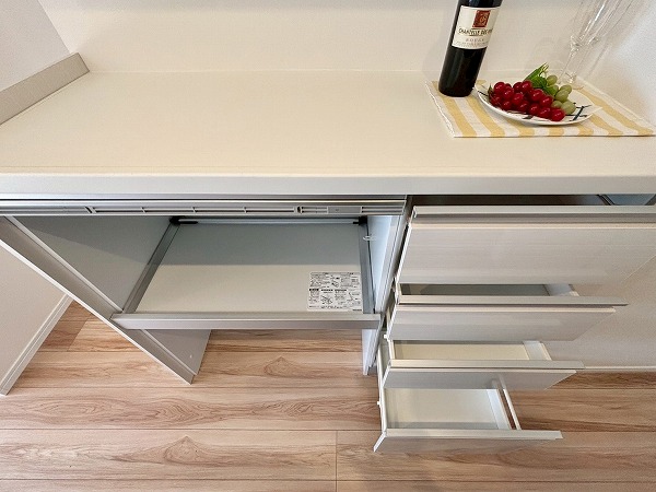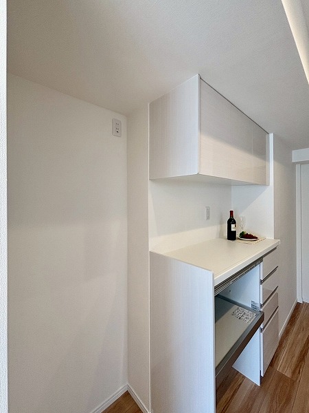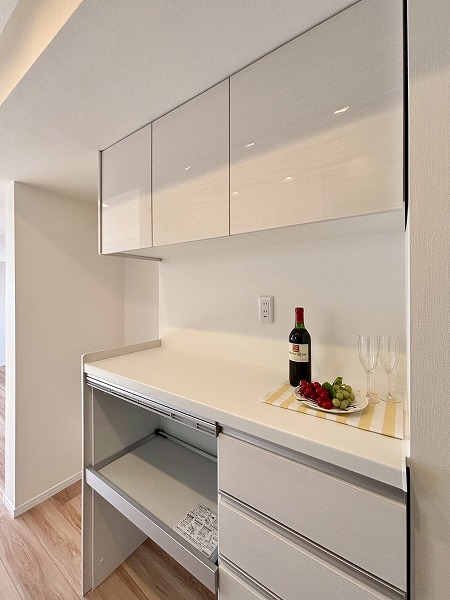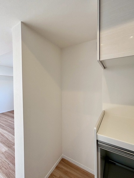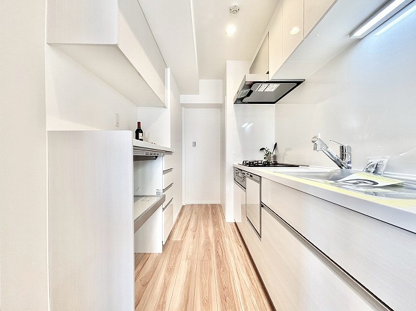 システムキッチンはお部屋の雰囲気にマッチした白を基調としたデザインです。奥まった造りなので、出入り口にカーテンなどを設置してプライバシーを守ることが可能。キッチン上下に収納がある上に、背面に大きなカップボードが備わっているので、カトラリーや食材のストックまでスッキリしまえそう。