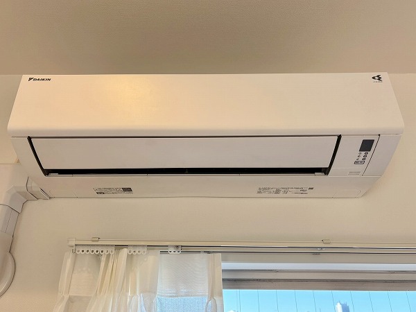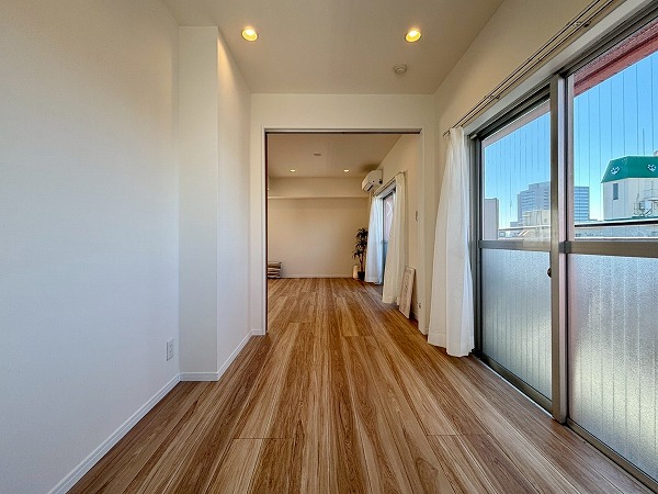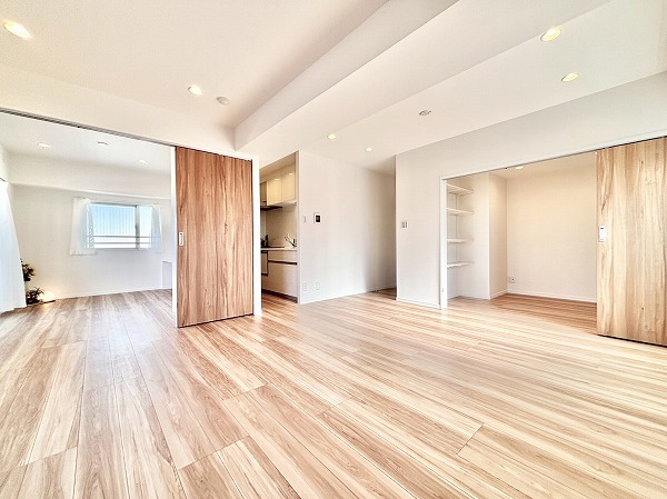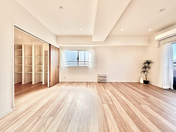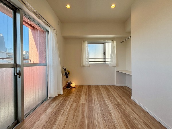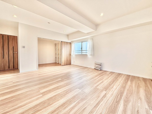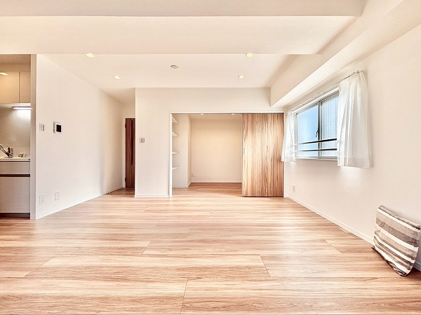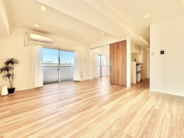 リビングダイニングキッチンは、南西側と南東側の2面に窓があり陽当たり良好です。白いクロスとフローリングを基調としたナチュラルテイスト仕様で、あらゆるテイストの家具とマッチします。エアコンを完備しておりオールシーズン快適に暮らせますよ。