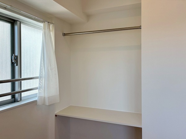 メインルームの先に広がる洋室。正確な広さは分かりませんが、セミダブルのベッドも設置可能なので、ご夫婦で使用する主寝室にも良さそうです。窓際には大きなカウンターが。お花や写真を飾ったり、椅子を置いてデスクスペースとして使用したりと様々な使い方ができますよ。