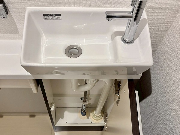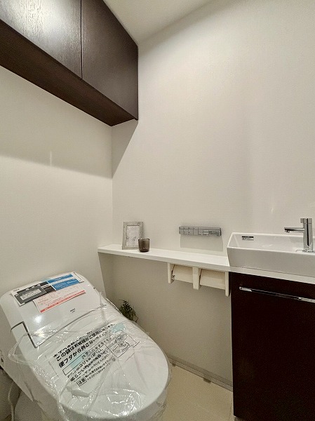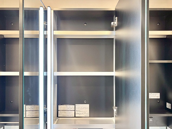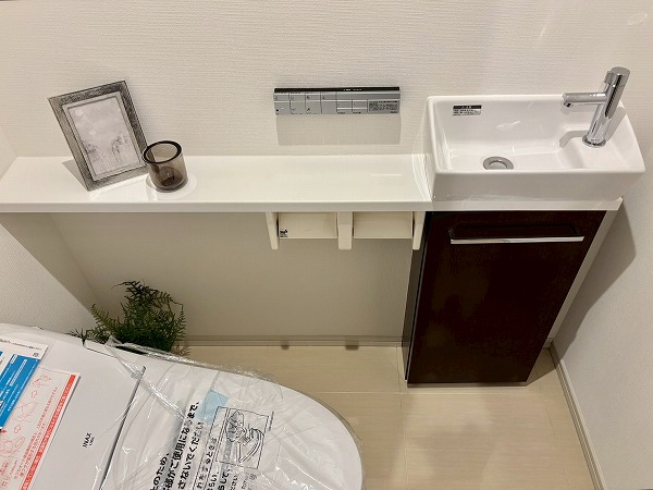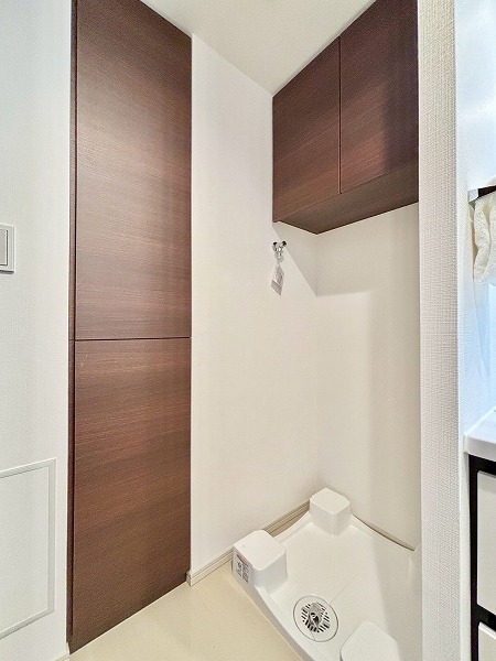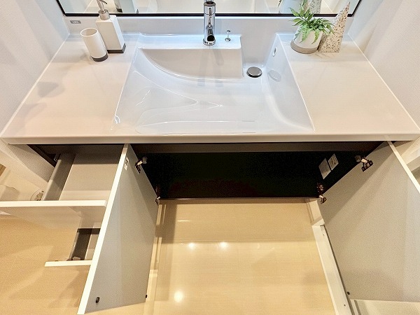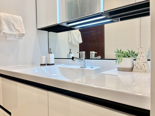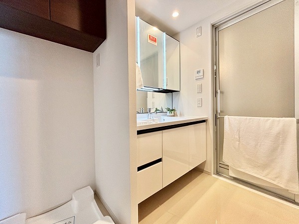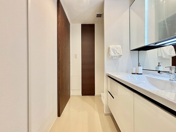 サニタリールームは玄関廊下を左手に進んだ突き当りに。洗面化粧台が大きいサイズになっていて、ご家族と並んで使用することも可能。洗面ボウル周りのカウンターが広く、タオルやスキンケア用品などを置きやすいのも嬉しいポイント。また、洗濯機置き場の傍にリネン庫を発見。乾燥が終わったリネンを畳んですぐにしまえます。