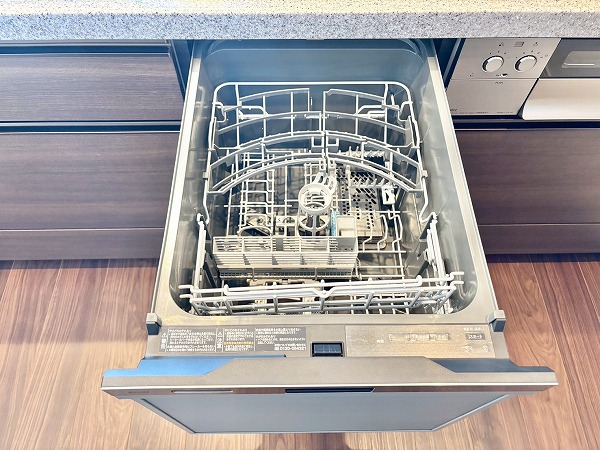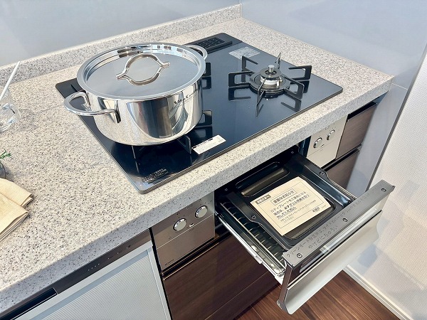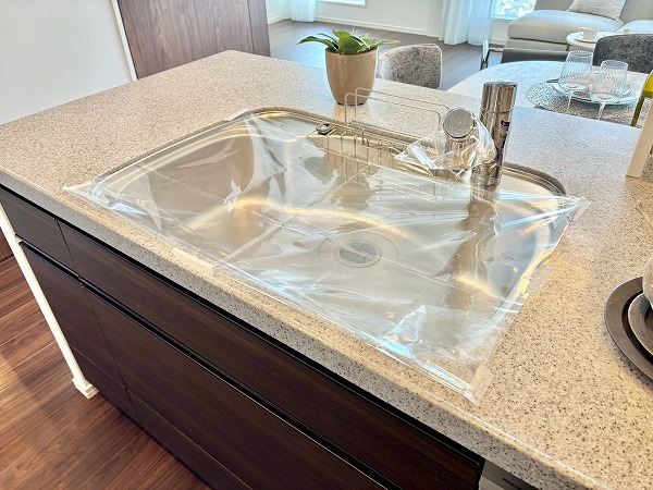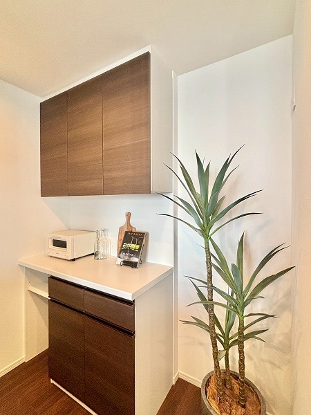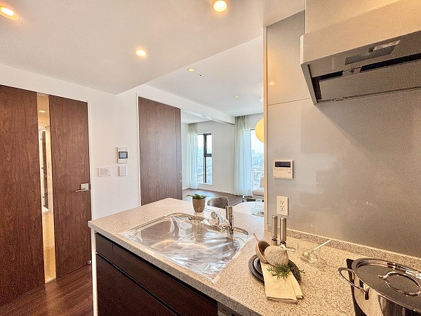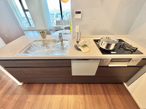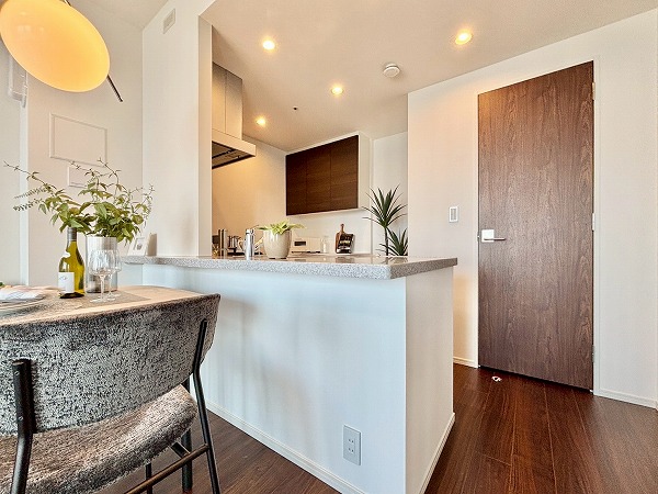 大理石調の素材がカウンターに使用された、リッチなデザインのペニンシュラキッチン。ガスコンロや食洗機、ディスポーザーが新規交換されています。気持ちよくお料理できそうですね。また、キッチン背面にカップボードが備わっていて、食器類やカトラリーをスッキリ収納可能です。