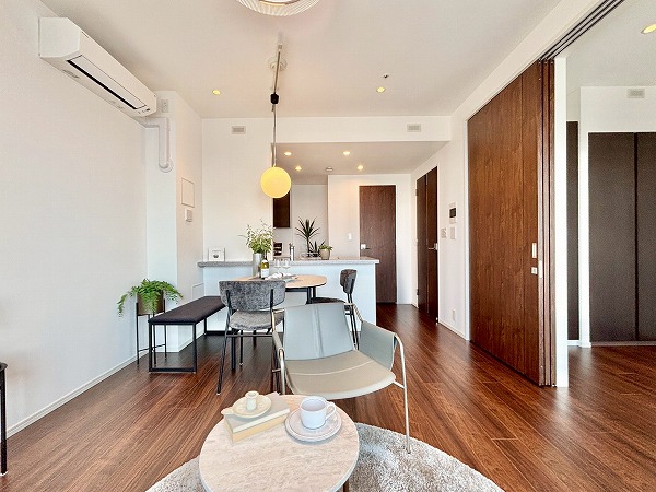 リビングダイニングキッチンはおよそ13.4帖。白いクロスと深みのあるフローリングのシンプルなデザインで、様々なテイストの家具とマッチする上に、長く住んでも飽きが来ません。ながい時間を過ごすマイホームにピッタリですね。エアコンや床暖房を完備しているのもポイント。