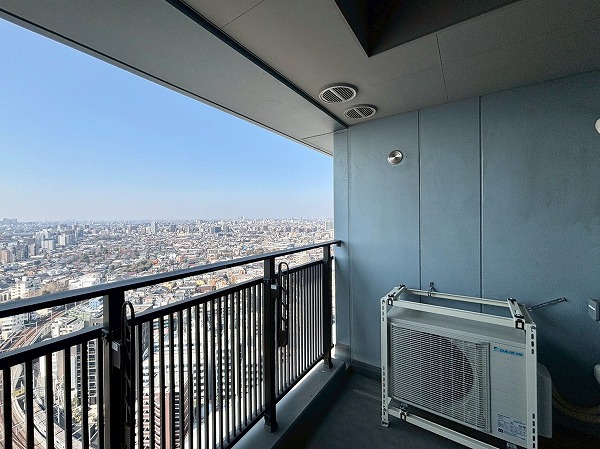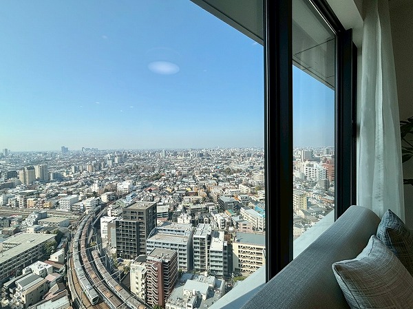 天井近くから足元まで広がるパノラマウィンドウは開放感抜群で、まるで青空を切り取ったかのよう。美しい青空とどこまでも続く東京の街並みを一望できます。タイミングが良ければ、電車が複数同時に通過する様子も楽しめますよ。電車が好きなお子様にはたまらない景色ですね♫