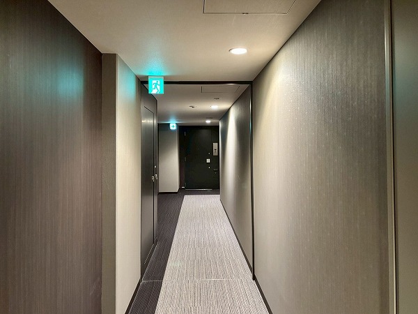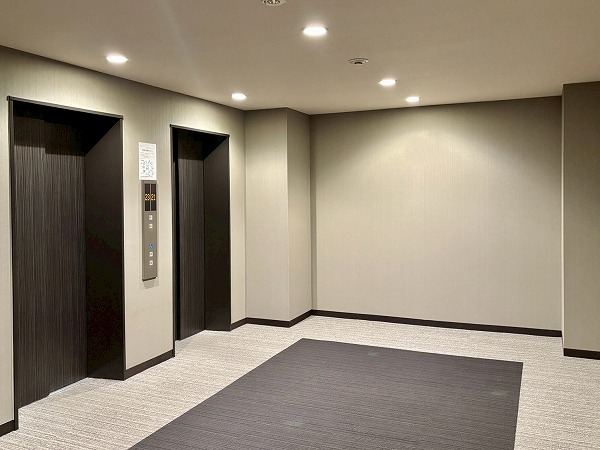 トリプルオートロックを解錠し、エレベーターホールへ進みましょう。4基のエレベーターは2基ずつ低層階用と高層階用に分かれていました。業者が使う非常用エレベーターも別の場所に。ビッグコミュニティならではの混雑が緩和されますね。