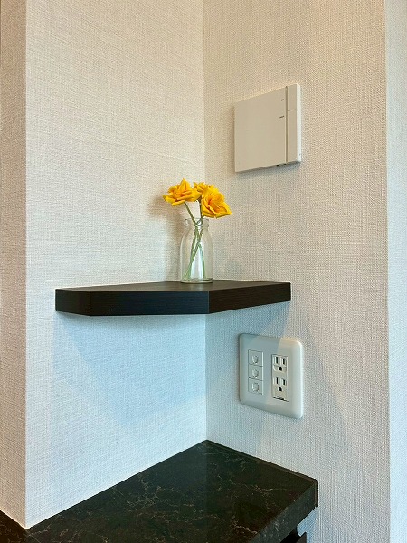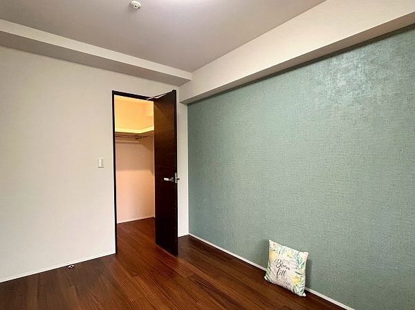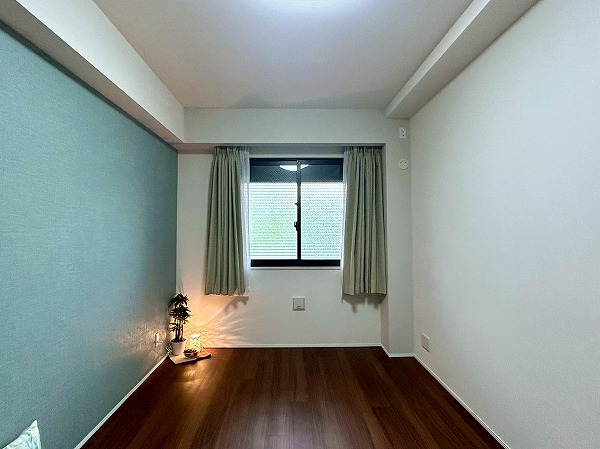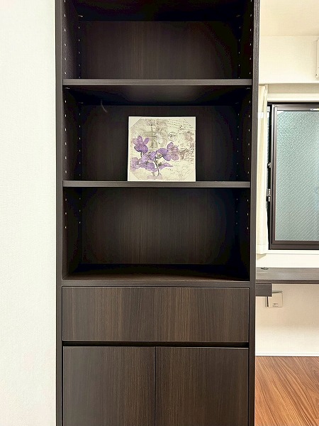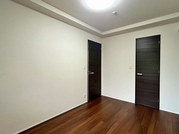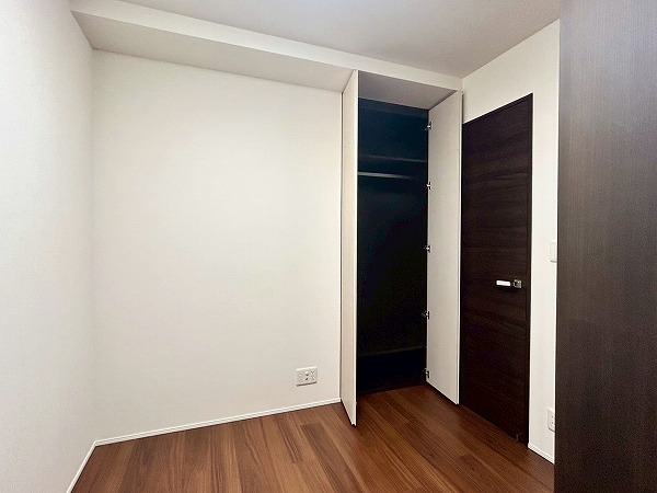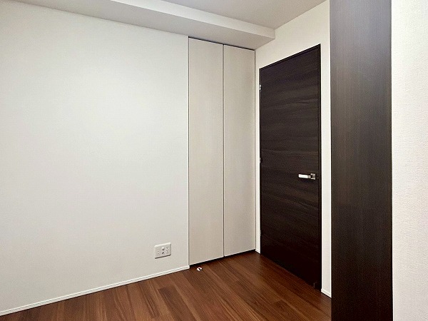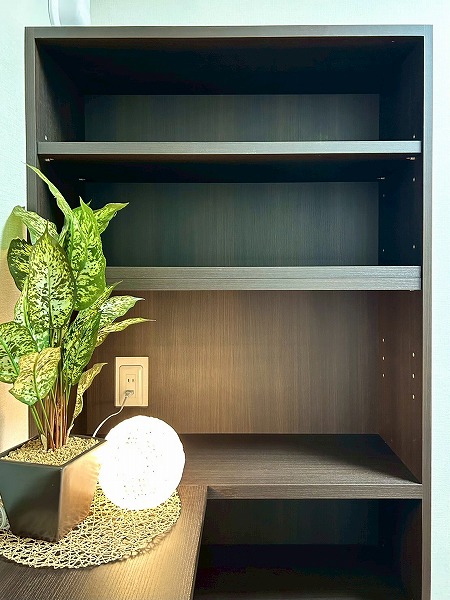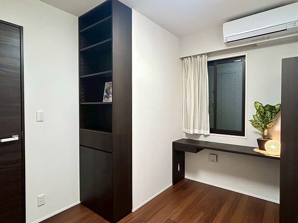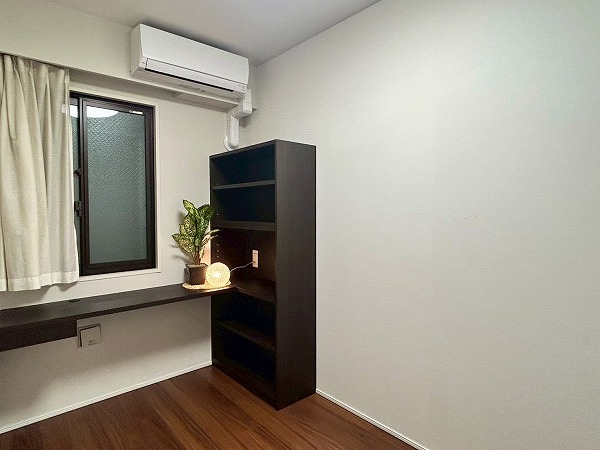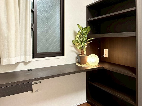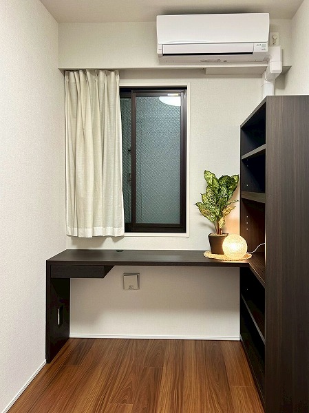 約5.0帖の洋室にはデスクと収納棚が設置されており、ワークスペースや、勉強机などにご利用いただけます♪収納棚にはコンセントが設置されており、PC作業が捗りそうですね!