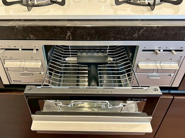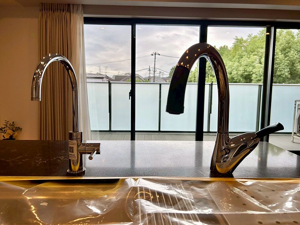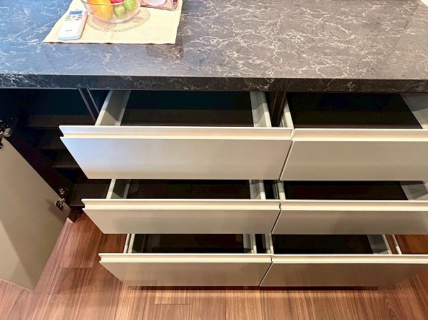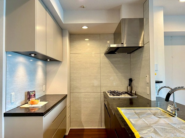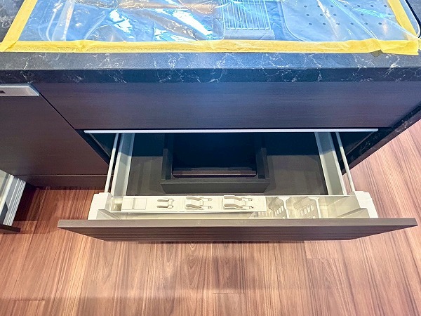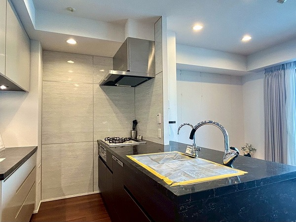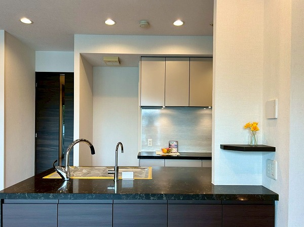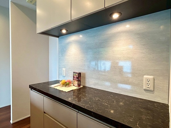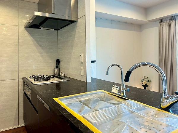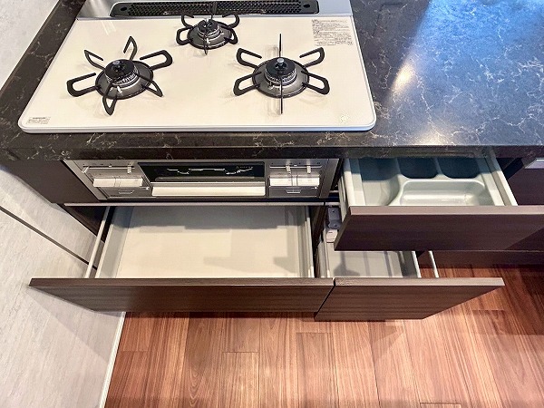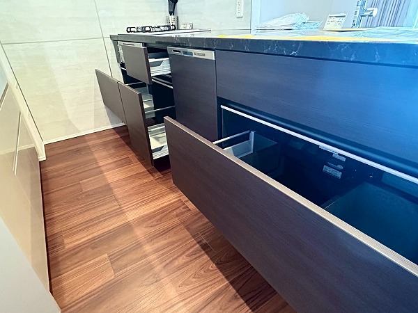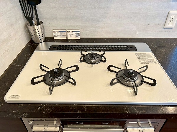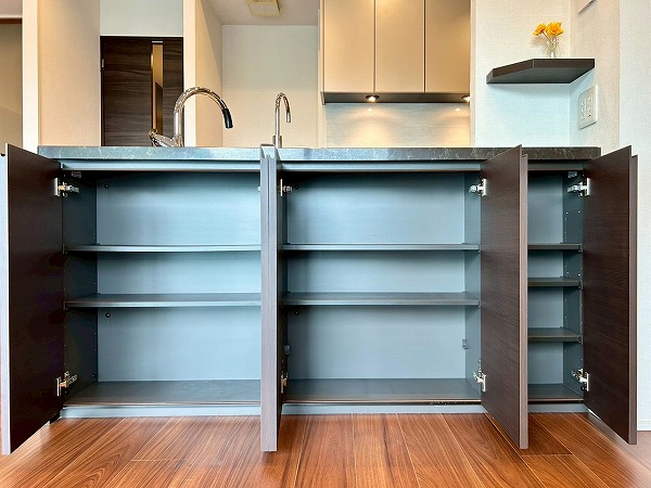 開放的なカウンターキッチンは料理をしながら家族や友人との会話も楽しめます♪カップボードも設置されており、豊富な収納が魅力的でお料理好きにはたまらないですね♡複数品の同時調理が可能な3口コンロ、便利な食洗機を搭載しているので、毎日の家事がスムーズに捗りそう✿