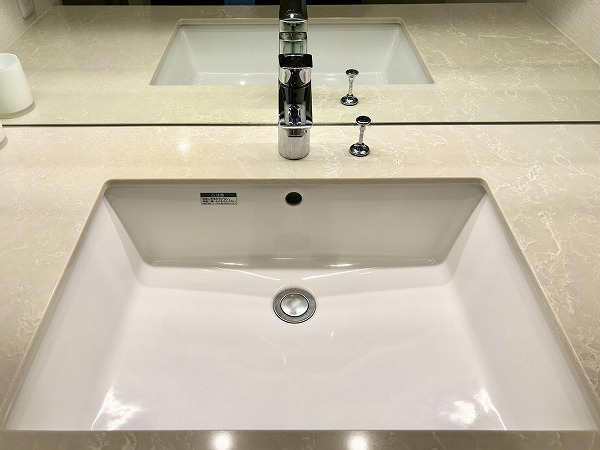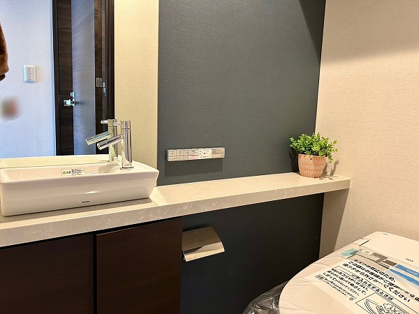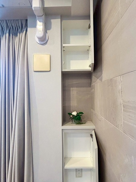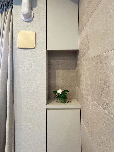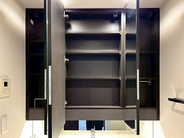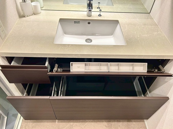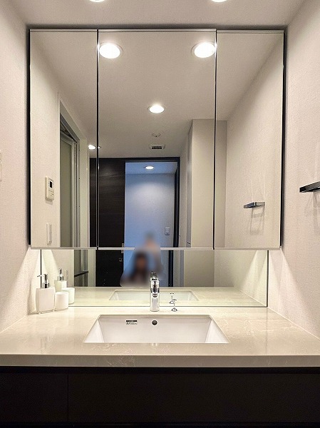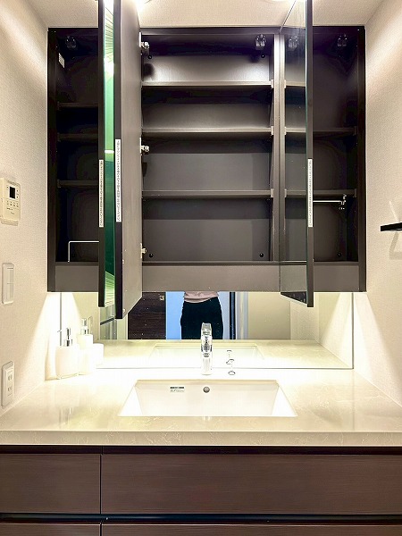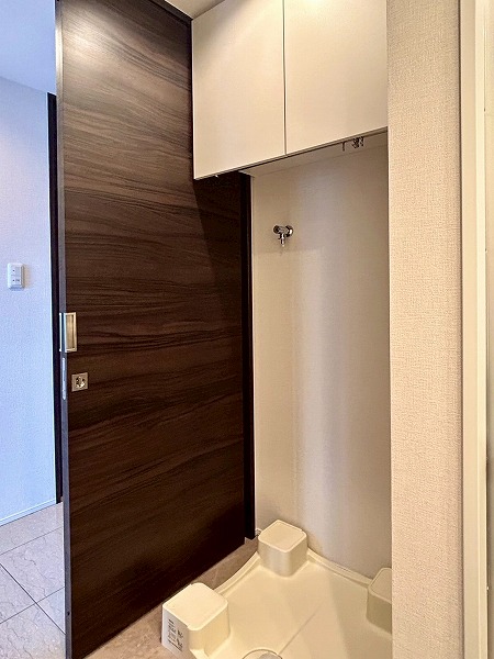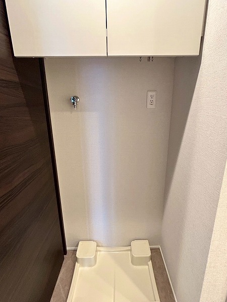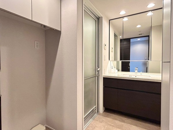 洗面化粧台、バスルーム、洗濯機置き場がまとまったパウダールーム。白を基調とした空間は清潔感を感じられますね✧高さのある収納棚も設置させており、日用品をスッキリと収納できます✦
