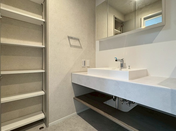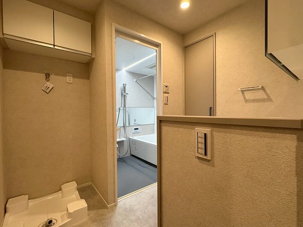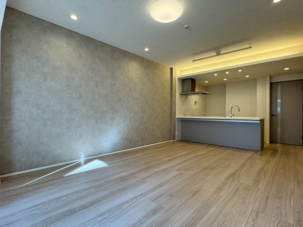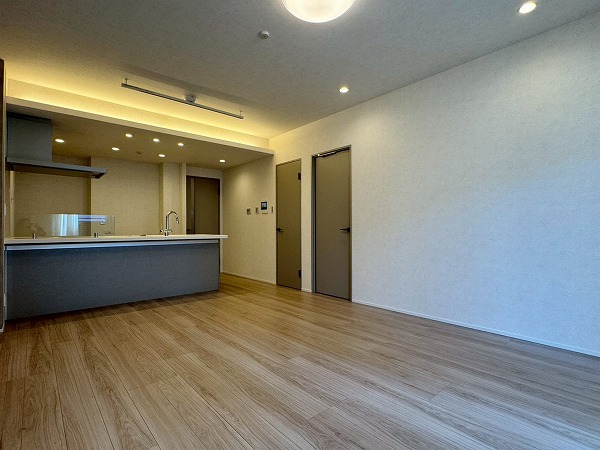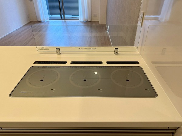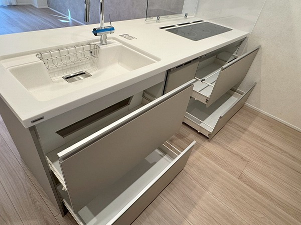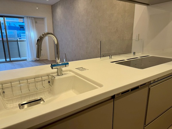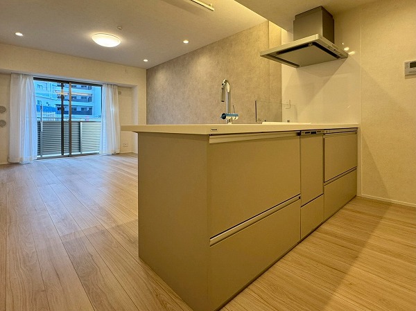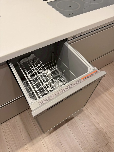 メインルームには床暖房が完備されており、寒い季節でも足元からやさしく暖まります。エアコンに頼りすぎることなく室内を快適に保てるため、小さなお子様やペットにも配慮された仕様。ベージュトーンの壁面が空間にやわらかなアクセントを添え、落ち着いた印象を与えていました。キッチンはリビング全体を見渡せる対面タイプ。調理をしながらでもお子様の様子を見守ることができ、IHコンロを採用しているため火災リスクが低くお掃除も簡単。さらに食洗機も完備され、忙しい主婦(夫)の手助けをしてくれる頼もしい設備・設計ですよ♪