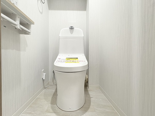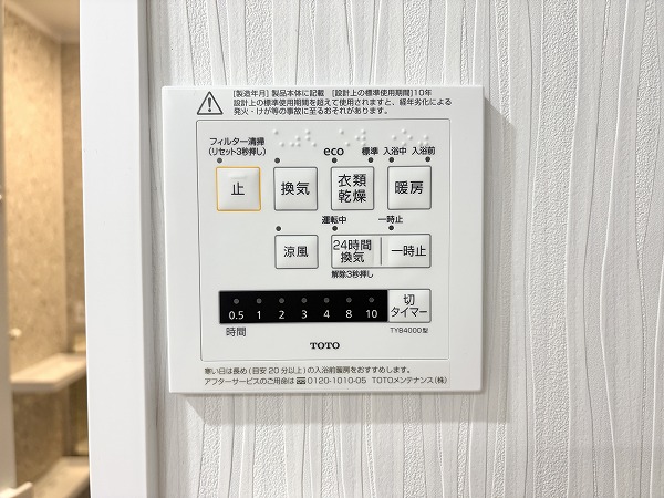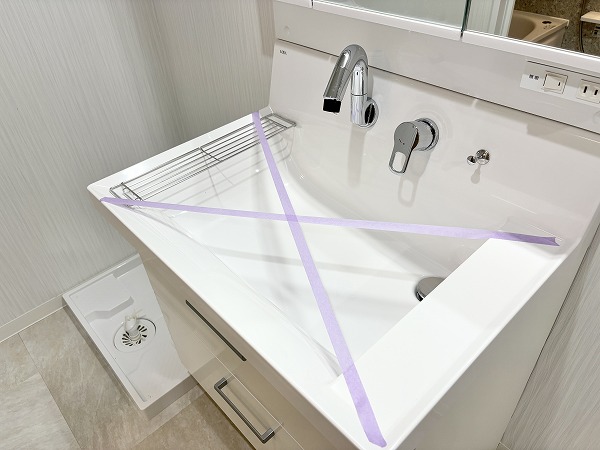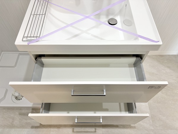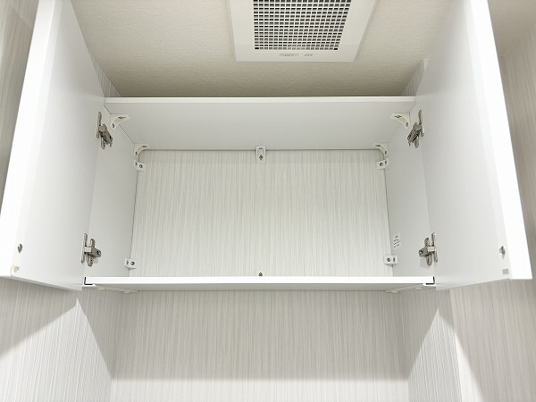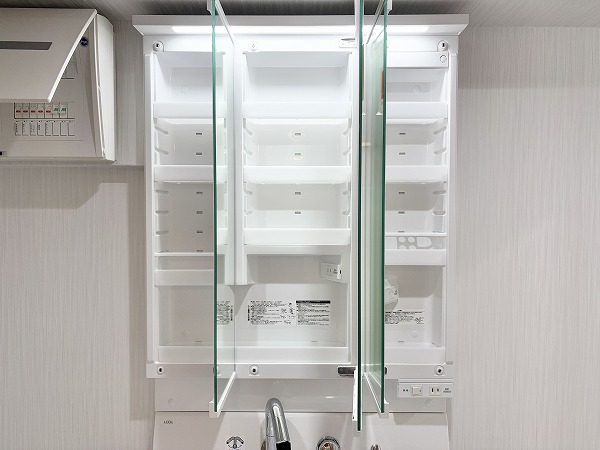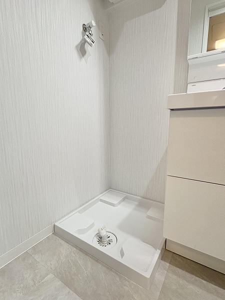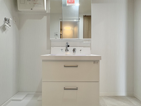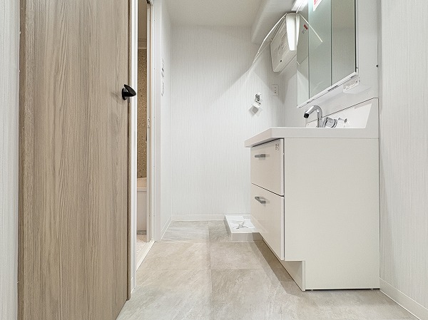 ホワイト×ベージュの清潔感あふれるサニタリールームは、水回り設備が1つにまとまっている使い勝手の良い空間です。洗面化粧台は3面タイプのミラーキャビネットを完備しているため、サイドや後頭部のチェックもスムーズに行えます◎