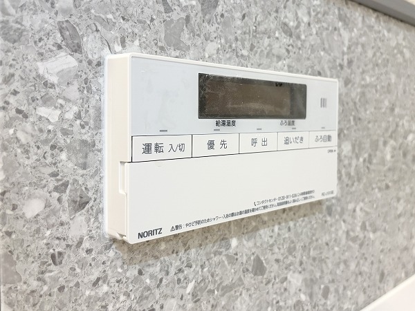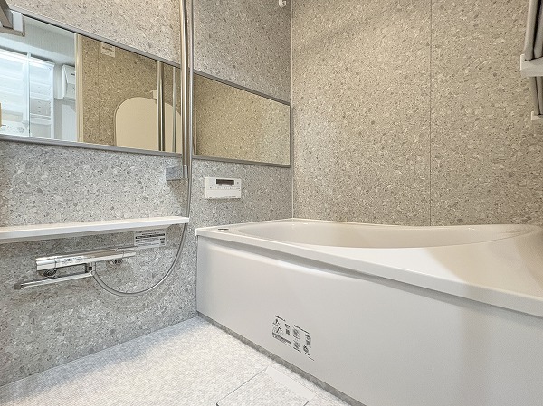 大理石調のバスパネルがスタイリッシュでオシャレなバスルームは、ワイドなミラーが設置されていて空間が実寸よりも広く感じられます✦快適なご入浴に欠かせない追い焚き機能が搭載されているため、疲れている日でもワンタッチでお湯を沸かし直すことが可能です。