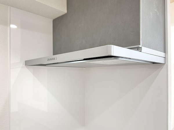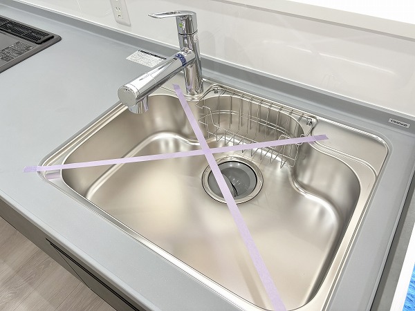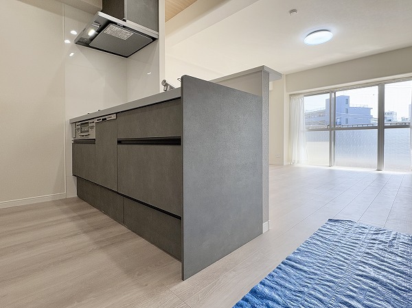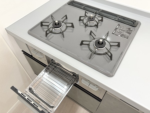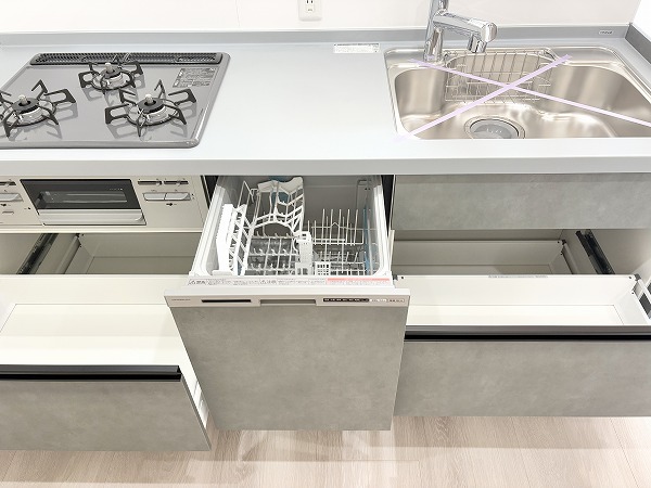 洗練された雰囲気が漂っているグレーのキッチン。対面型なので、調理中でもリビングにいるご家族やゲストとのコミュニケーションを取りやすく楽しい時間を過ごせそうです。3口コンロ、グリル、食洗機が完備されているため、毎日の家事効率が上がりそうですね。