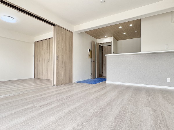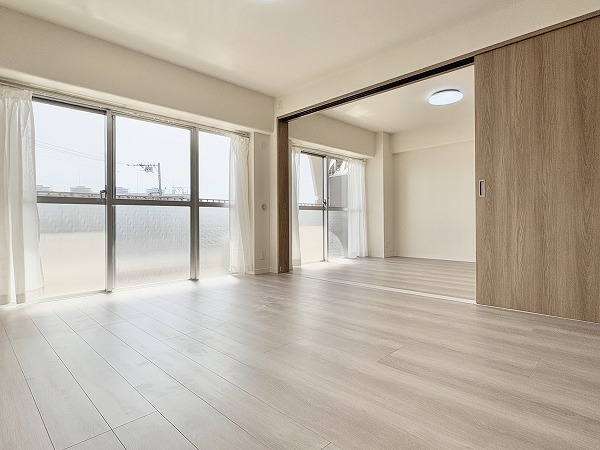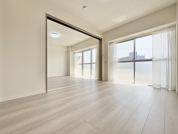 専有面積69.30㎡、ファミリー層におすすめな3LDKのお部屋をご紹介します!リビングダイニングは南東向きで日当たり良好☀撮影時も柔らかな日が差し込み、心地の良い空間が広がっていました。隣接している約6帖の洋室とは、引き戸で簡単にスペースを分けることができます。