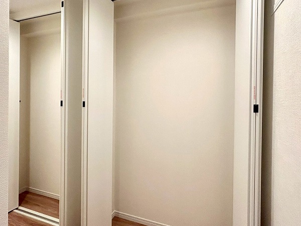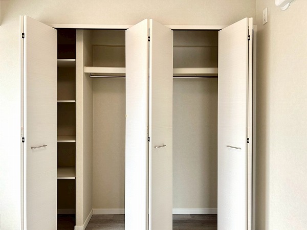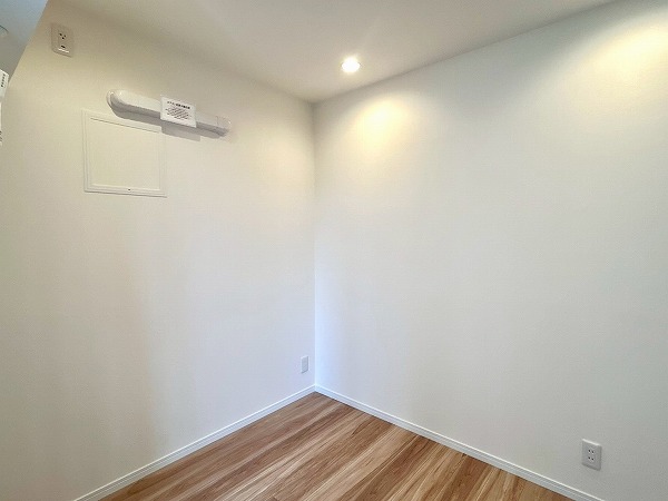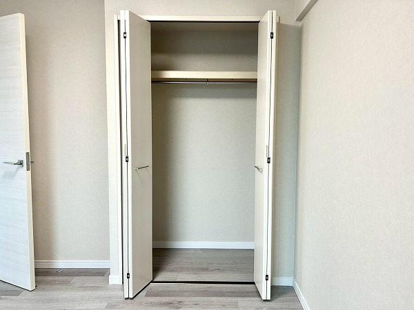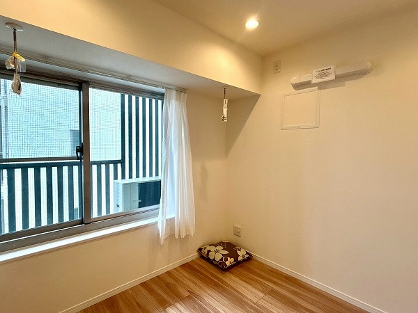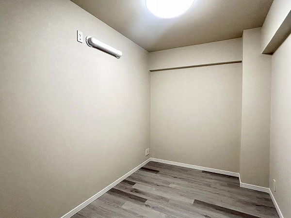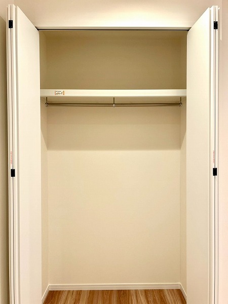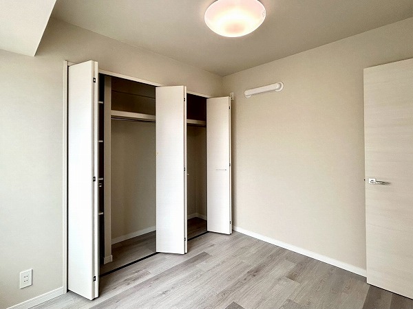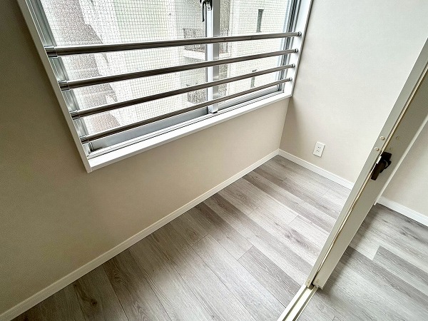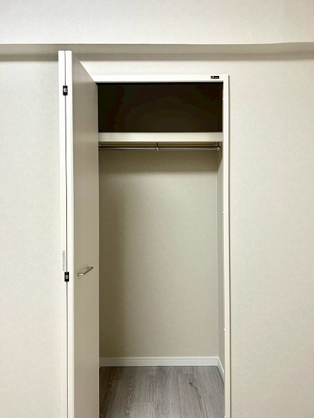 窓際の洋室は、ワークスペースとしてのご利用におすすめです。コンパクトながらも集中しやすい空間で、在宅ワークや作業にも適しています。クローゼットにはハンガーパイプに加え上部収納も備えており、季節外の衣類やバッグ類もすっきりと収納可能。