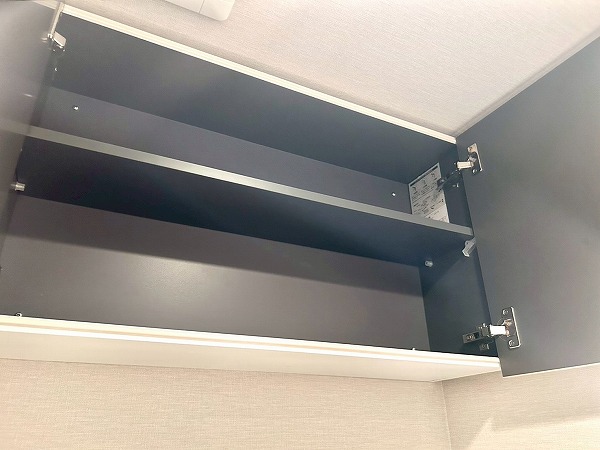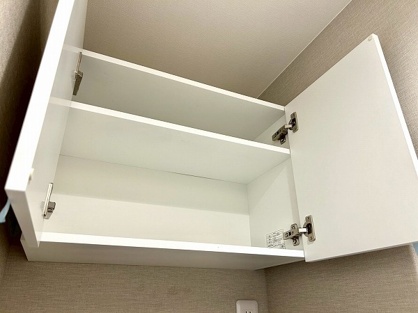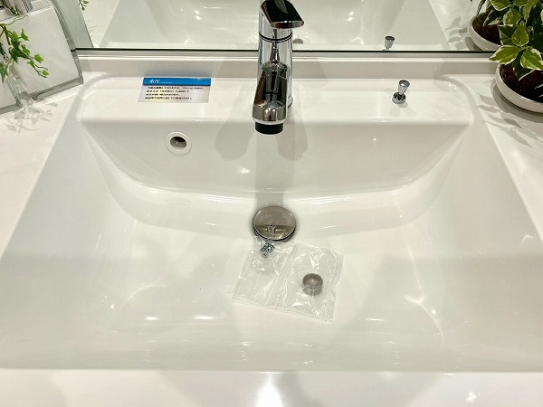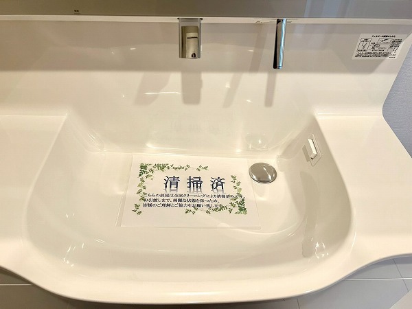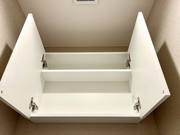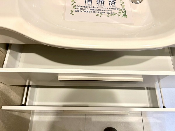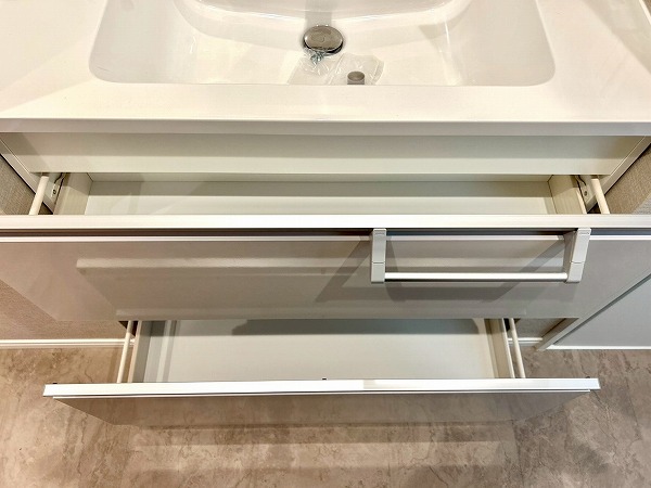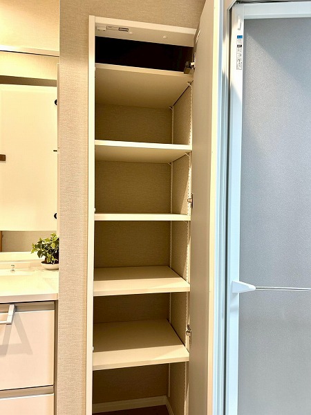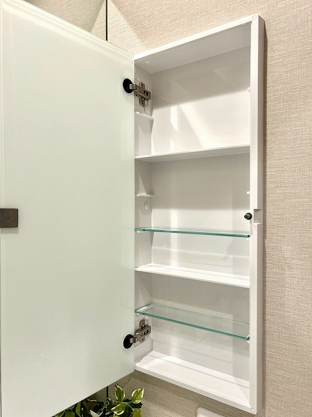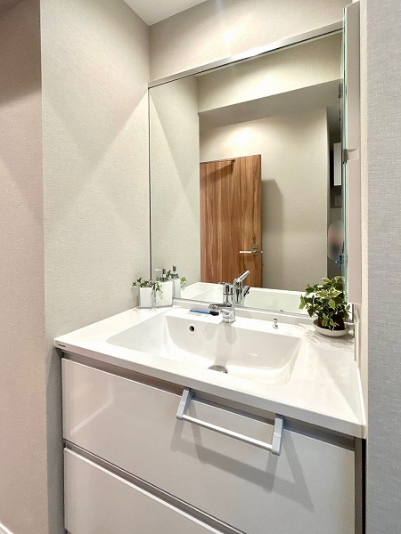 大きな鏡が印象的な洗面化粧台は、朝の身支度をスムーズにサポートします。壁付けの収納棚も備えており、歯ブラシや化粧水などの小物類もすっきりと整理・収納できます。