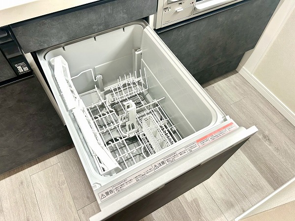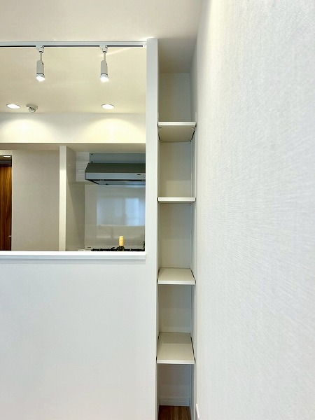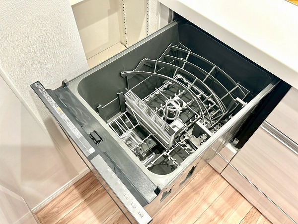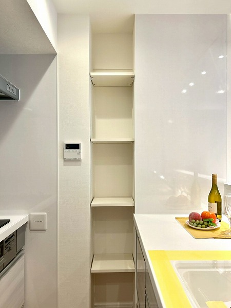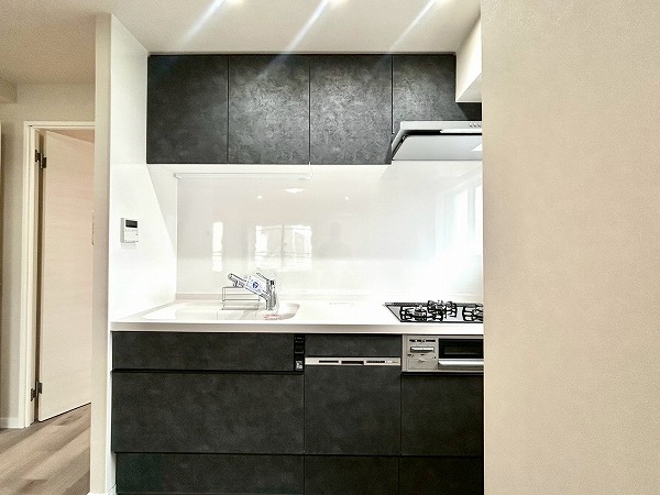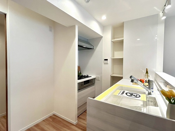 キッチンは壁付けタイプで、お料理に集中しやすい設計です。キッチン横の窓からは自然光が入り、換気もしやすく快適です。上部には十分な収納スペースを備えており、調理器具や食器などをすっきりと整理できます。