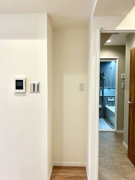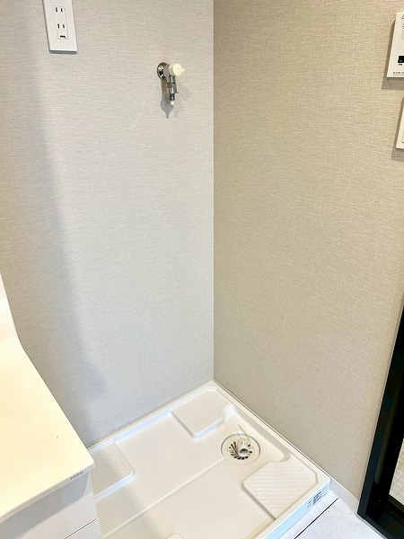 化粧洗面台・洗濯機置き場・バスルームが一体となったパウダールームは、白を基調とした清潔感あふれる空間。バスルームには浴室乾燥機と追い焚き機能を備えており、毎日の快適な入浴をサポートします。