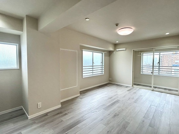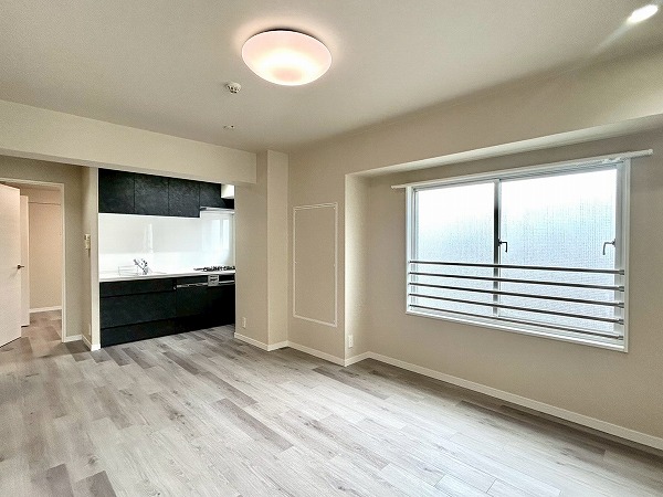 窓際にはサンルームが設けられており、天候を気にせず洗濯物を干せるのも嬉しいポイントです。キッチンは壁付けタイプで、お料理に集中しやすい造りとなっています。LDKに隣接する2つの洋室は動線がスムーズで使い勝手が良く、約5帖の洋室には大きなクローゼットも備わっているため、収納面も安心です。