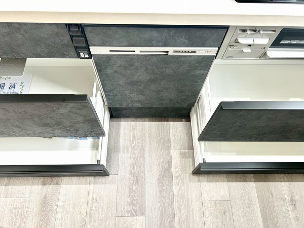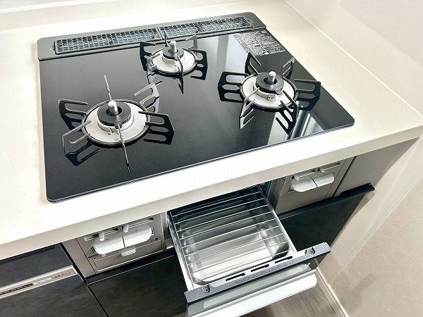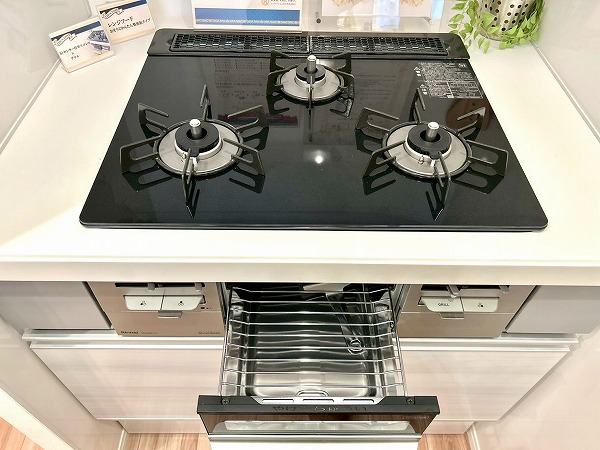 開放感のあるⅡ型ペニンシュラキッチンは調理がしやすく、ゆとりある調理スペースが魅力です。コンロが独立しているため、揚げ物の際も周囲に油が飛びにくく、清潔に保ちやすい点も嬉しいポイント。