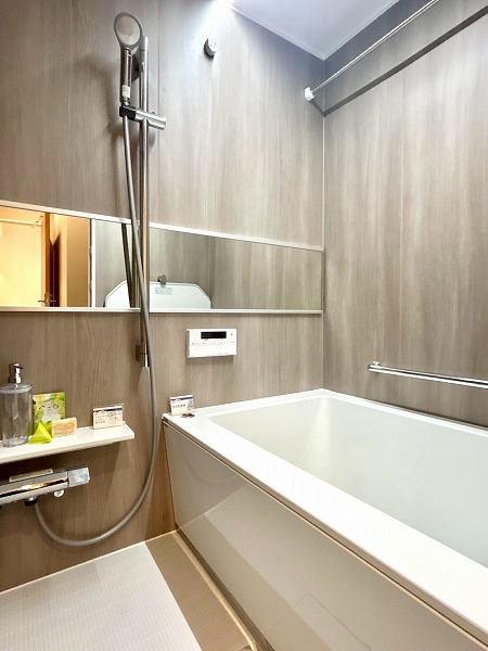 洗面化粧台・洗濯機置き場・バスルームがまとまったパウダールームは、効率的でスムーズな生活動線を実現します。バスルームには追い焚き機能や浴室乾燥機を備えており、日々の入浴時間をより快適にお過ごしいただけます。