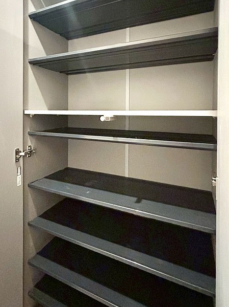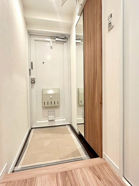 玄関には高さ調整可能なシューズボックスを備えており、ヒールやブーツなどもすっきりと収納できます。玄関前の廊下にはクローゼットも設けられており、アウトドア用品などをまとめて収納することで、外出時の準備もスムーズに行えます。
