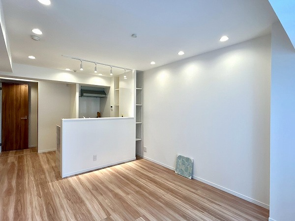 ゆとりのあるLDKは、主要な家具をゆとりを持って配置できる広さです。埋め込み照明が空間に開放感をもたらし、木目調フロアを多く取り入れた内装が温かみと安心感を演出しています。