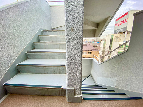 開放感のある外廊下に玄関扉が並んでいます。鮮やかなブルーの扉が印象的ですね〇外階段が2箇所にあるので、エレベーターが混み合っている時や緊急時にはこちらのご利用がオススメです。
