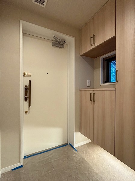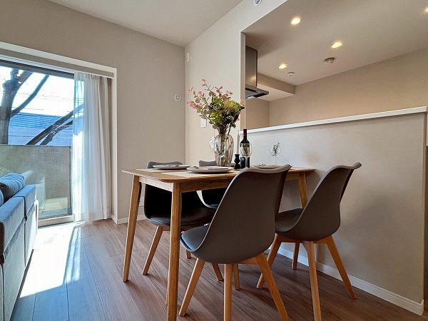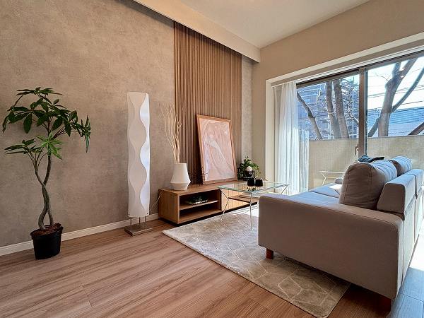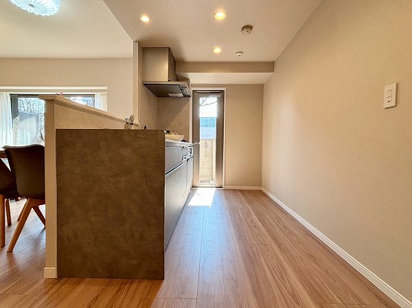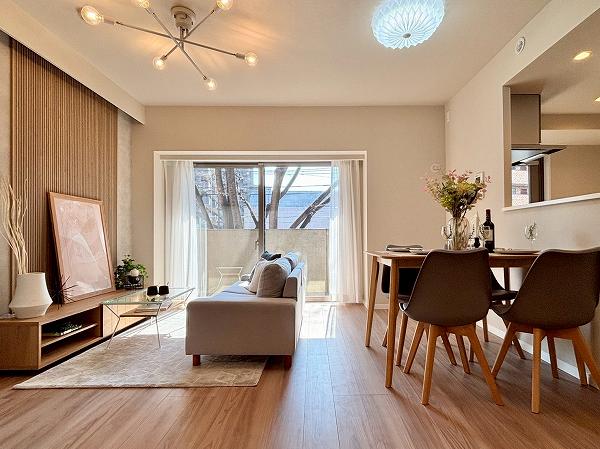 ご紹介のお部屋は2階部分、専有面積68.75㎡の2SLDK。2025年10月にリノベーションが完了し、室内は清潔感あふれる仕上がりです。玄関を抜けてまず印象的なのは南向き約13.6帖のLDK。ホワイト×木目でまとめた空間に自然光がやわらかく広がり、思わず深呼吸したくなる心地よさ。床暖房付きで、冬場も足元からじんわりと温まります。