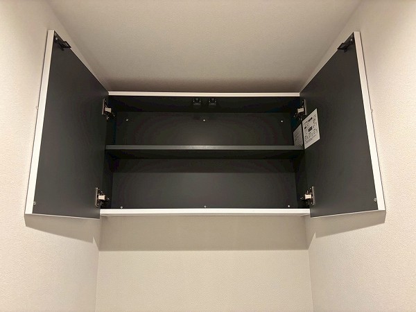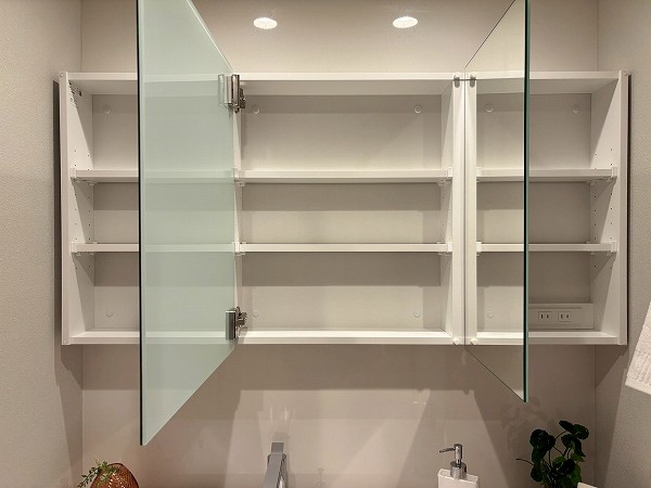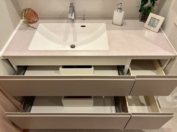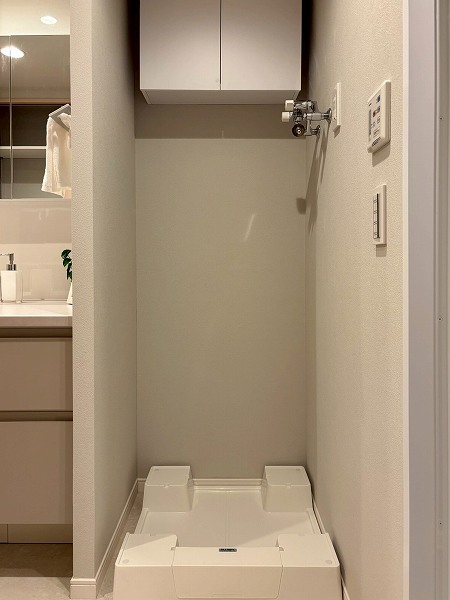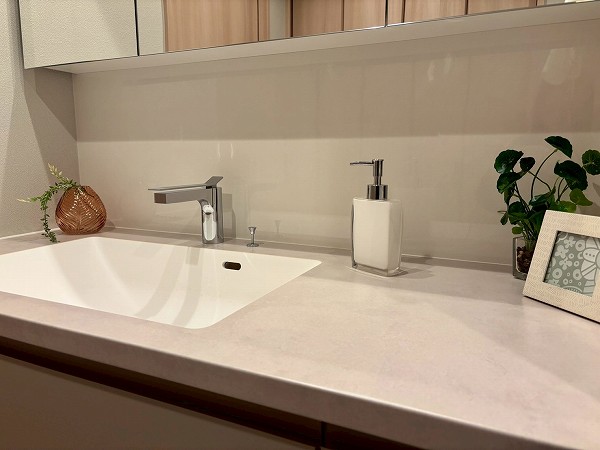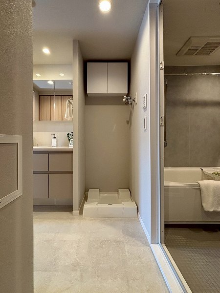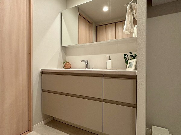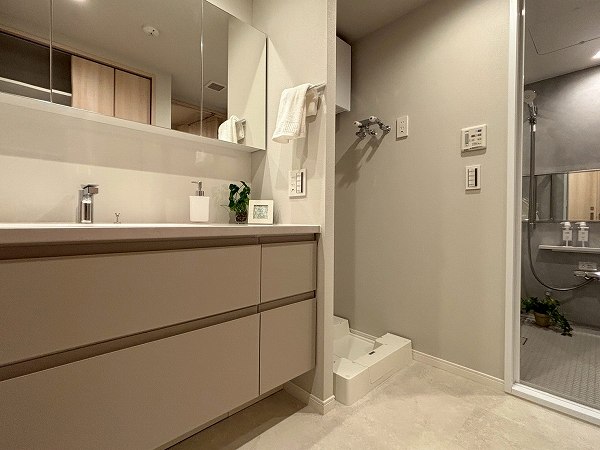 洗面化粧台・洗濯機置き場・バスルーム・リネン庫が揃うサニタリースペースは、ホワイト×グレーのスタイリッシュな装い。。ワイドカウンター仕様の洗面台にはミラーキャビネットを備え、細かなアイテムもすっきり収納。朝の身支度がゆとりをもって行えますね♥