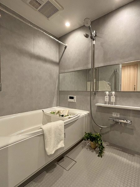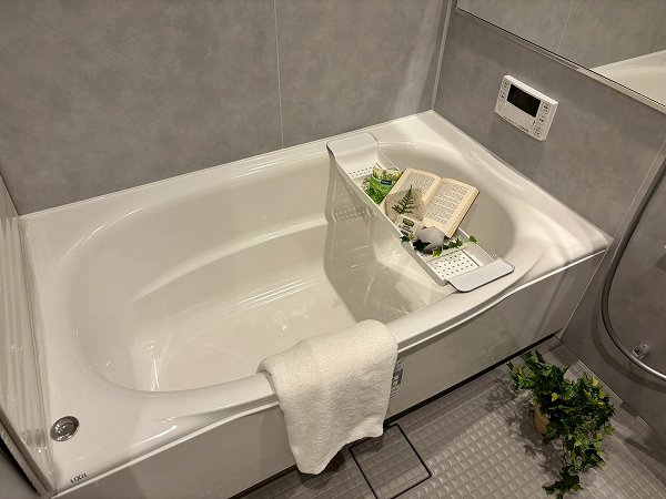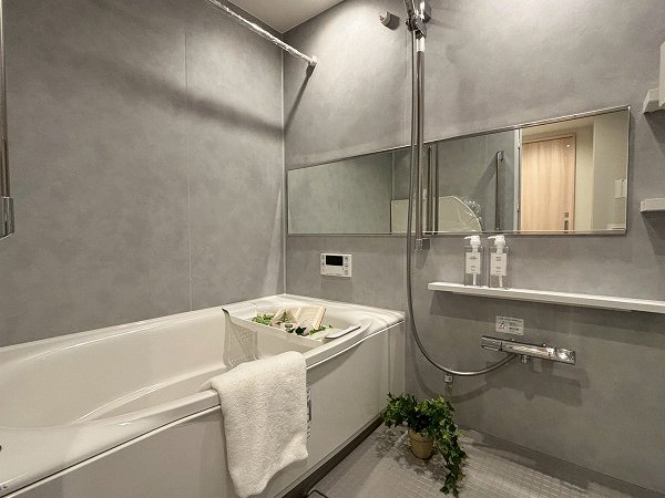 1418サイズのゆとりあるバスルーム。追い焚き機能付きで、帰宅時間が異なっても快適な湯温をキープできます。浴室乾燥機も備わり、雨の日のお洗濯にも重宝。半身浴を楽しみながら読書や音楽をゆっくり味わうなど、心と身体を整える時間をお過ごしいただけますよ♩