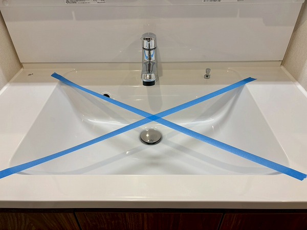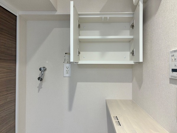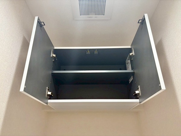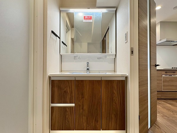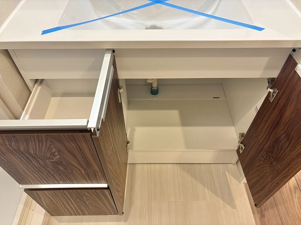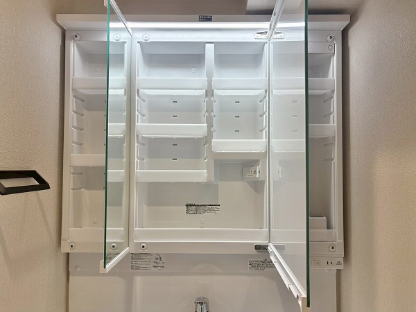 大きな三面鏡がついた洗面台は、毎日の身だしなみチェックもばっちり◎歯ブラシや化粧品もキャビネットにスッキリ収納でき、下のスペースには石鹸や洗剤のストックもたっぷり入ります。朝の身支度も楽しくなる、便利な空間です。