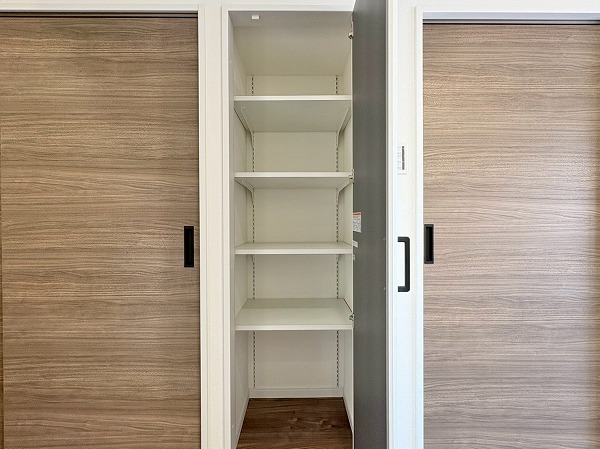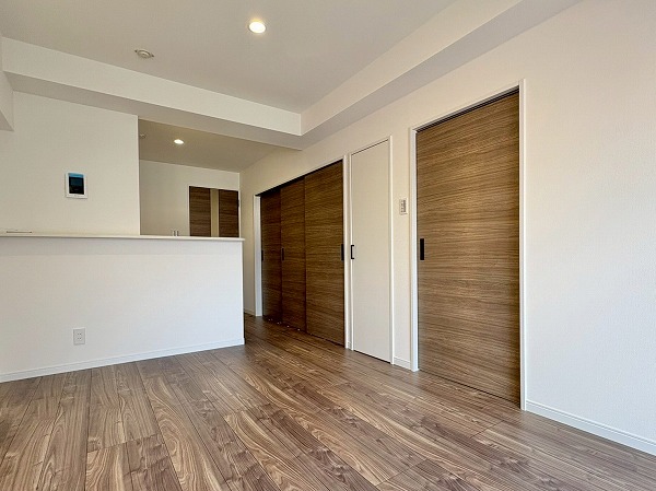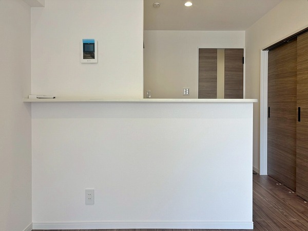 約11帖のリビングダイニングキッチンは、縦長の形で自然とリビングとダイニングが分かれます◎壁面には扉付きの棚がついており、雑貨や日用品を整理するのにぴったり◎棚板は自由に動かせるので、自分だけの収納ルールを作れちゃいますよ。