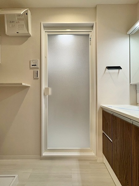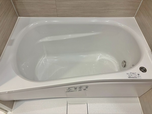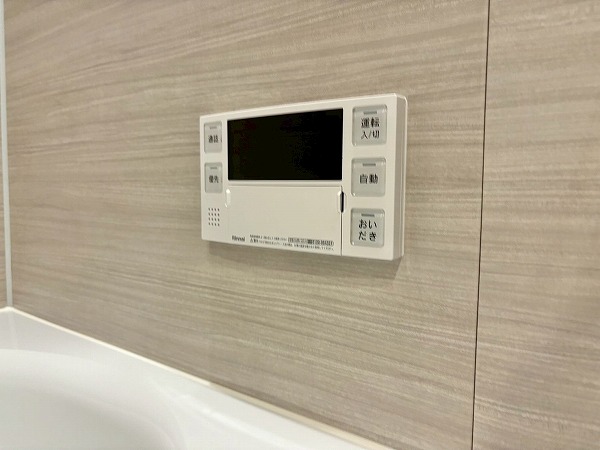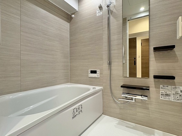ベージュの木目パネルが優しい雰囲気を感じさせるバスルーム。大きなバスタブでゆったりリラックスできます。追い焚き機能でいつでも温かいお湯に浸かれるのも嬉しいポイント。浴室乾燥もついているので、雨や花粉の日も洗濯を気にせず干せます☀
