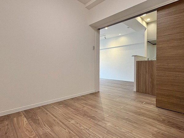 こちらは約4帖と少々小さめな洋室ですが、天井が高くもむけられているため窮屈感はありません。スライドドアを開ければメインルームからやわらかな光が入って、開放的に感じられます。閉めれば静かな空間になるので、仕事や趣味に集中したいときにもぴったりです。