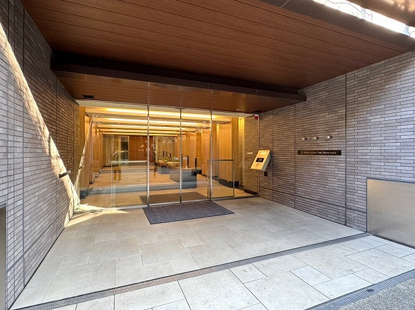 こちらはマンション正面のエントランスです。まるでホテルの入り口のような高級感のあるエントランスは、オートロック付きです。デザイン性に優れたポーチライトが可愛らしいですね。エントランスは裏手にもあります。