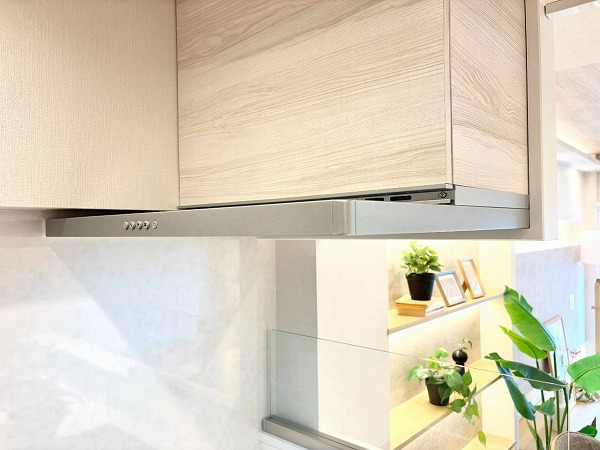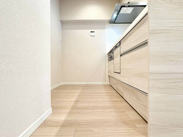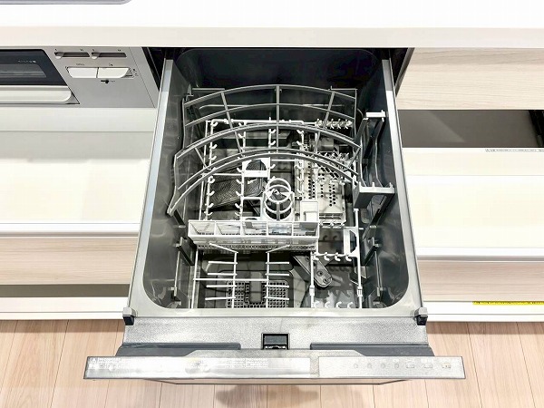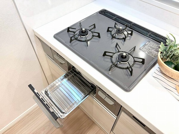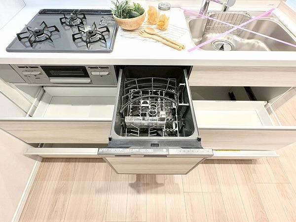 リビングダイニングと自然につながるペニンシュラキッチンは、木目のやさしい風合いが印象的。食洗機とグリル付き3口コンロを搭載し、日々の料理から後片付けまでスムーズにこなせますね。